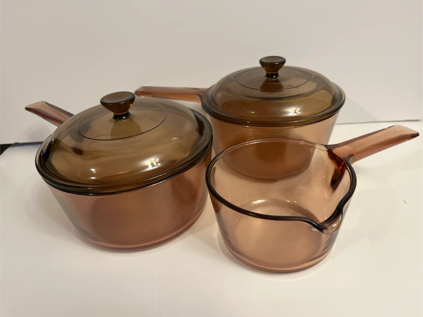 Set of three Pyrex Amber Visions cookware pieces. This durable glass cookware is microwave and oven safe. Includes 2 sets of glass sauce with lid and one open saucepan.