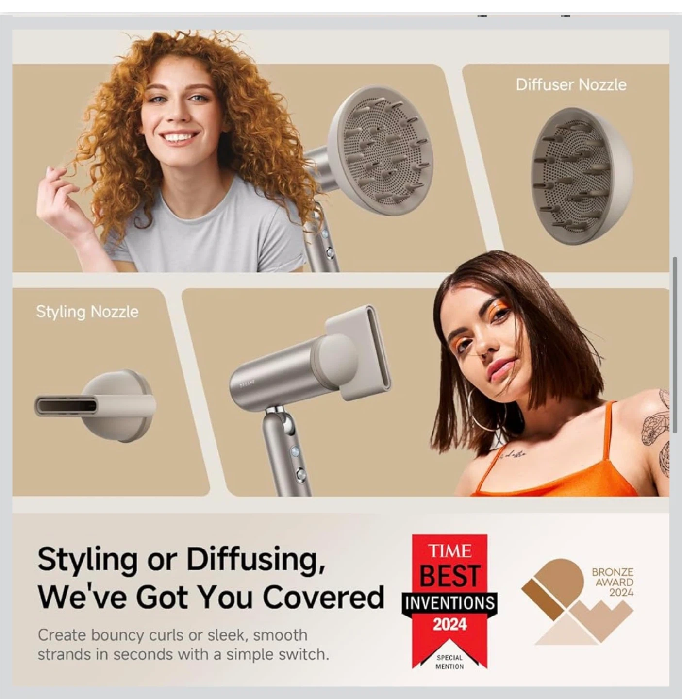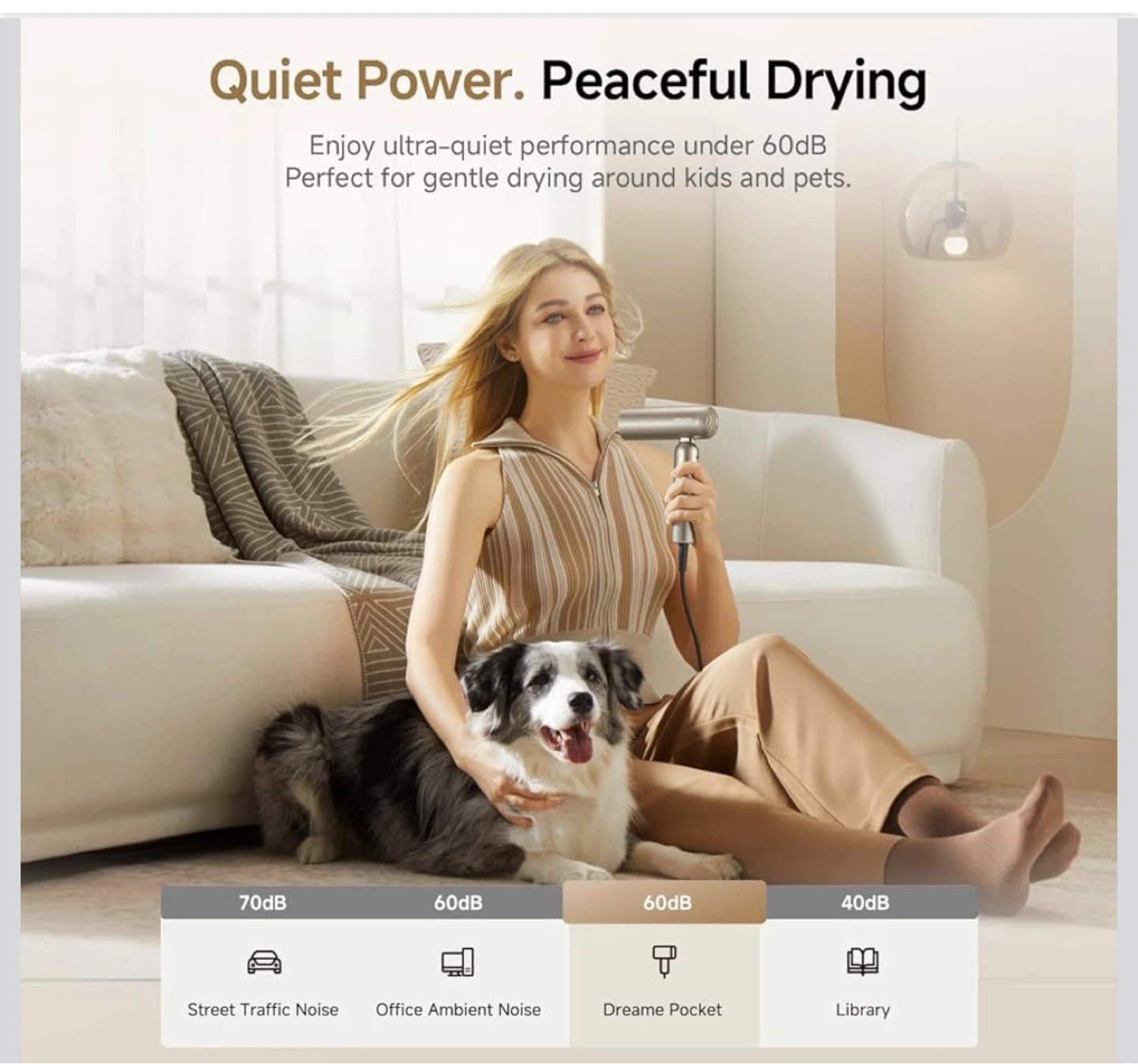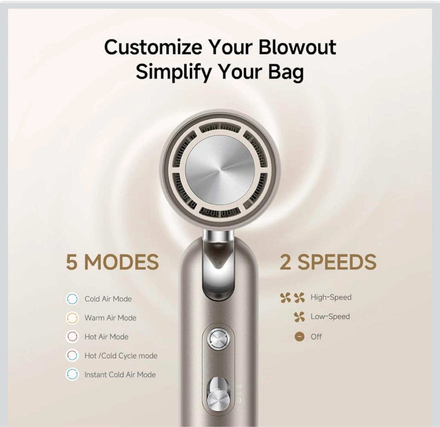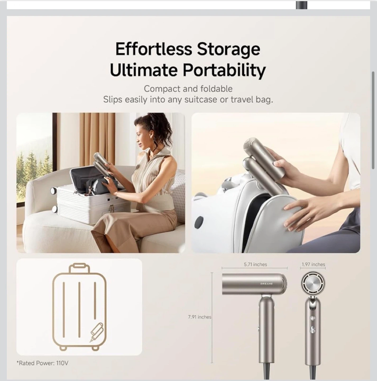 This DREAME pocket hair dryer is foldable and ultra-lightweight for ultimate portability. It features a 110,000 RPM brushless motor for fast drying and comes with 2 snap-on magnetic attachments. Its quiet operation is under 60dB, making it suitable for use around kids and pets.