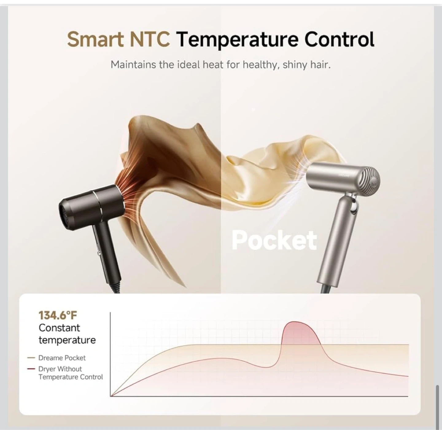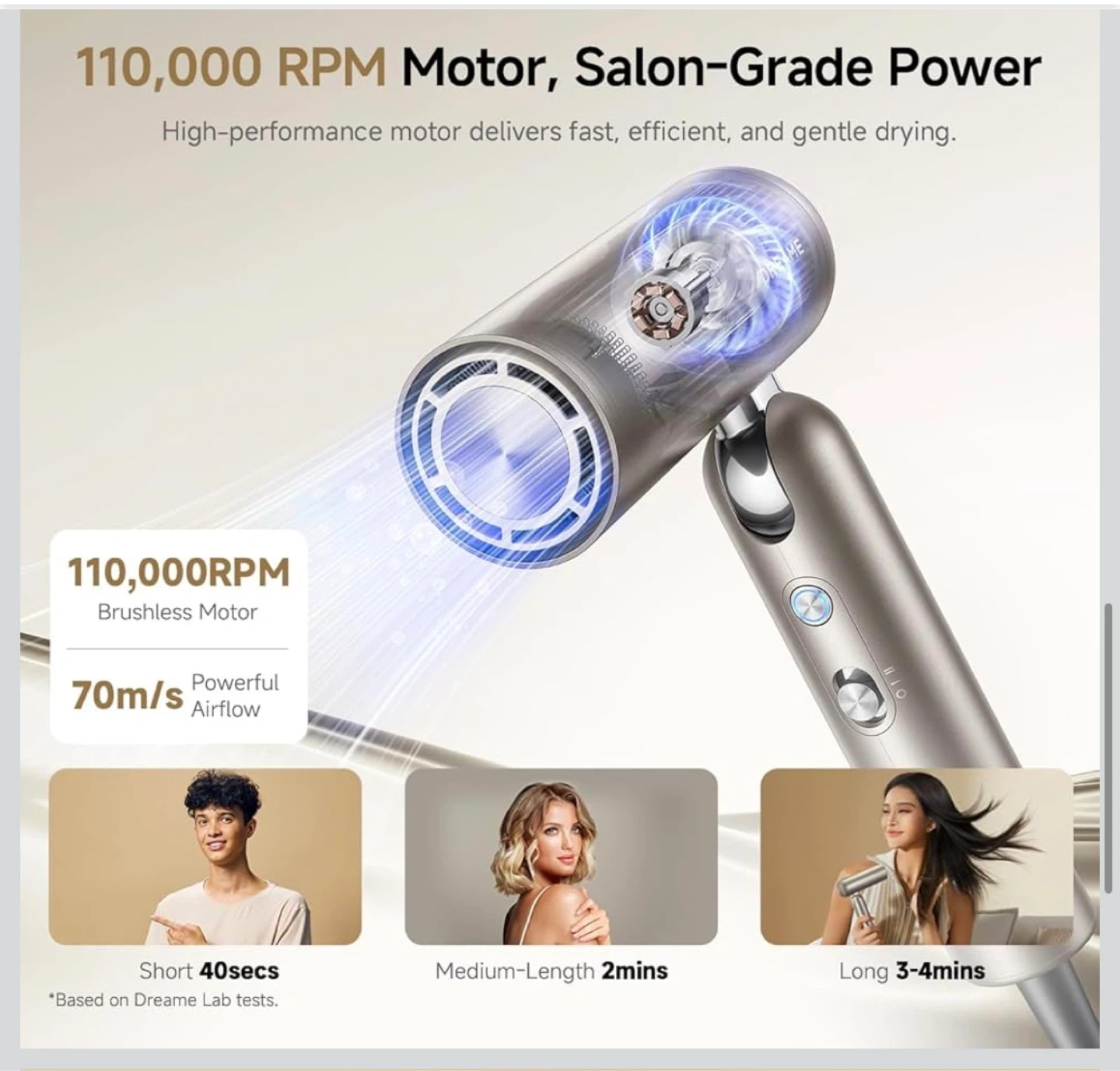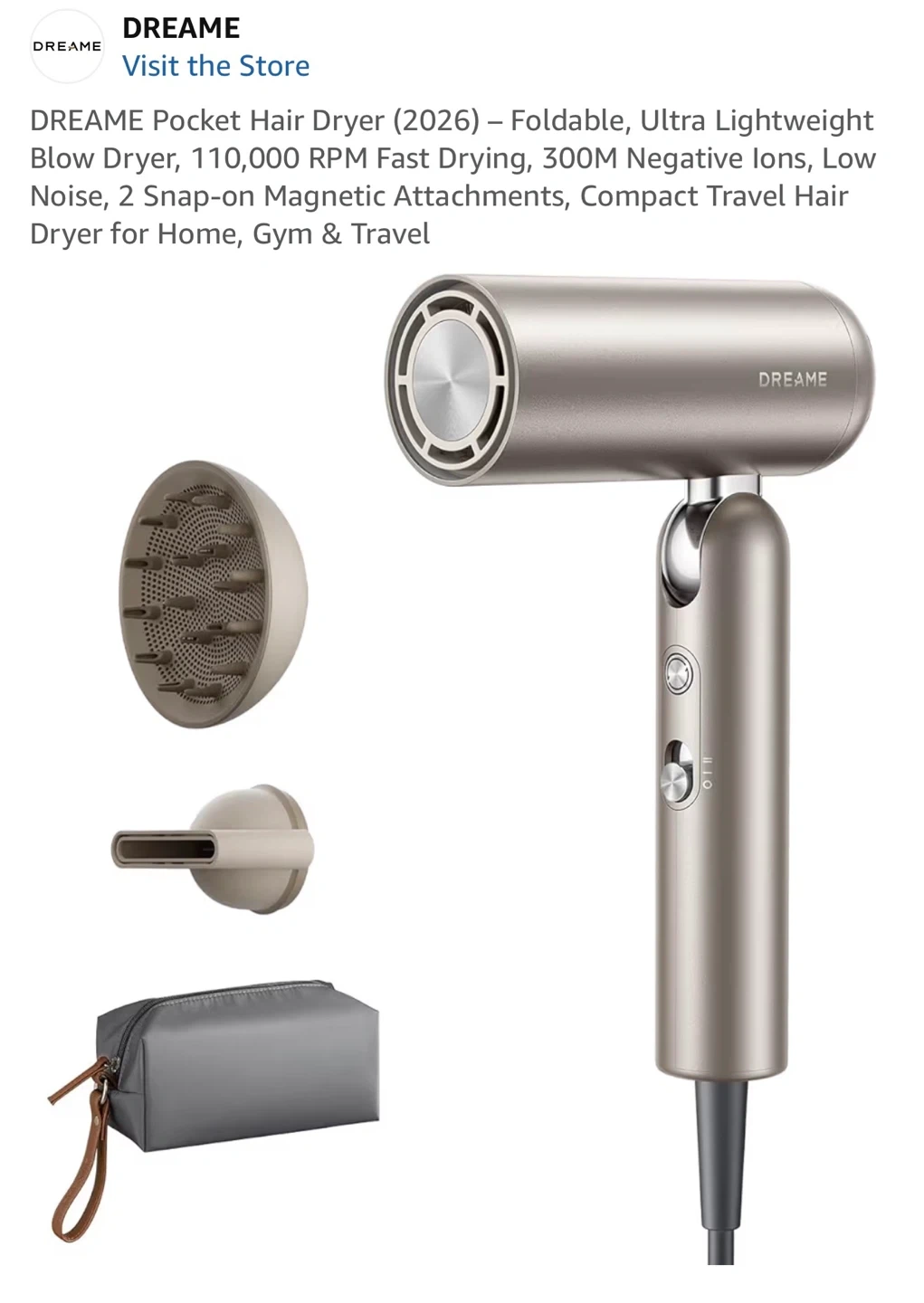 This DREAME pocket hair dryer is foldable and ultra-lightweight for ultimate portability. It features a 110,000 RPM brushless motor for fast drying and comes with 2 snap-on magnetic attachments. Its quiet operation is under 60dB, making it suitable for use around kids and pets.