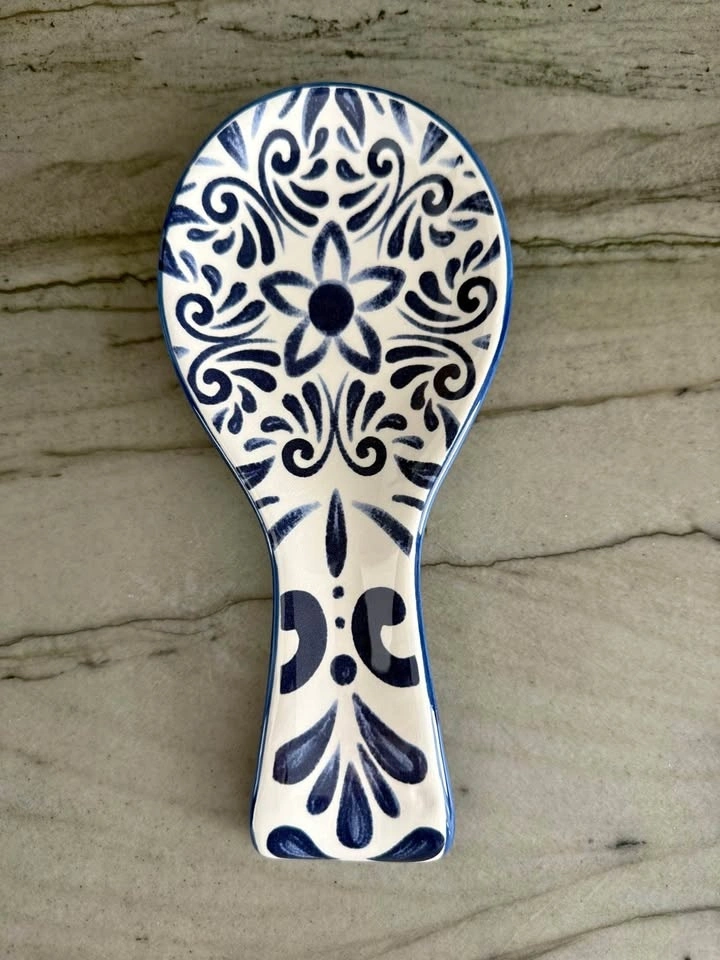 Add a touch of charm to your kitchen with this beautiful blue and white ceramic spoon rest. The classic floral pattern and glossy finish make it both functional and decorative on your countertop. Made from durable glazed ceramic with an elegant blue floral design on white. Perfect for holding cooking spoons while preparing meals and easy to clean. Pickup in Battery Park City.
