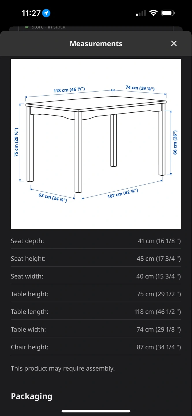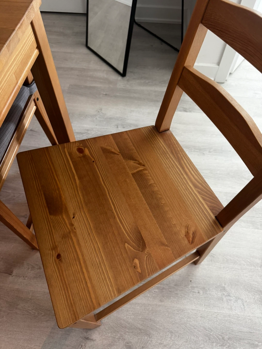 Table dimensions: 118 cm (length) x 74 cm (width) x 75 cm (height). Chair dimensions: seat height 45 cm, seat width 40 cm, seat depth 41 cm. Solid pine.