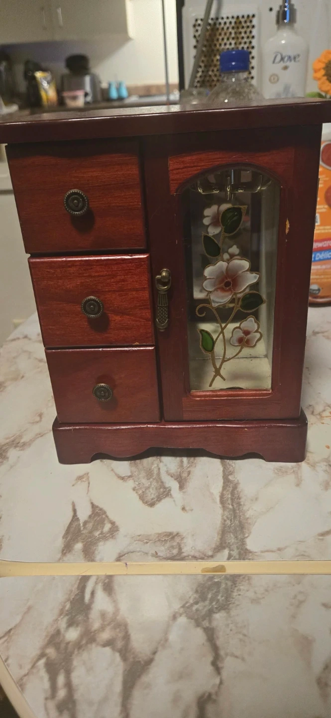 This is a lovely wooden jewellery box with three drawers on the left side. The right side features a glass door with a decorative floral design. It's perfect for organizing rings, necklaces, and other small accessories. The rich wood finish would look great on any dresser or vanity!