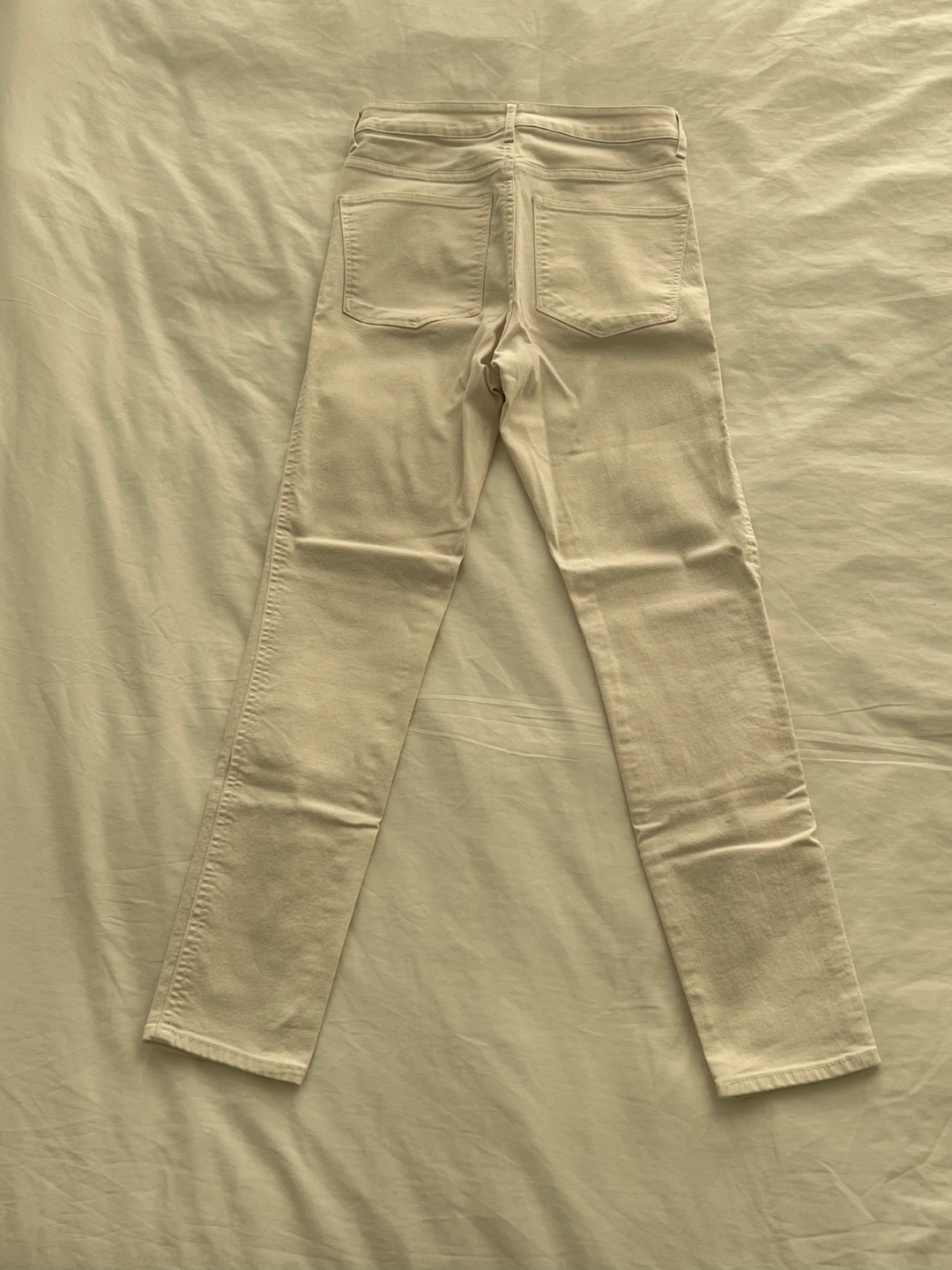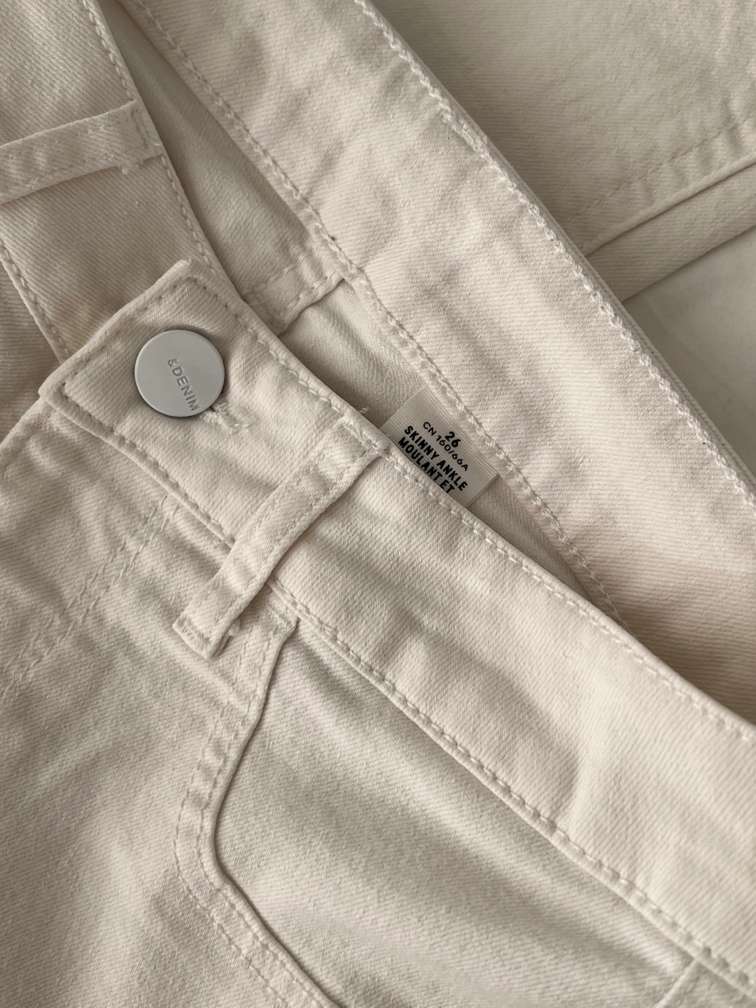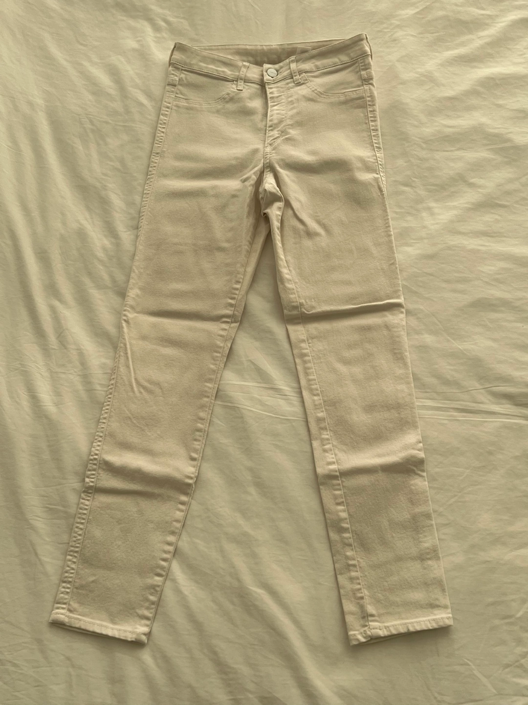 Cream-coloured skinny ankle jeans. Size 26. Lightweight. Made in Bangladesh. 77% cotton, 21% polyester, 2% elastane.