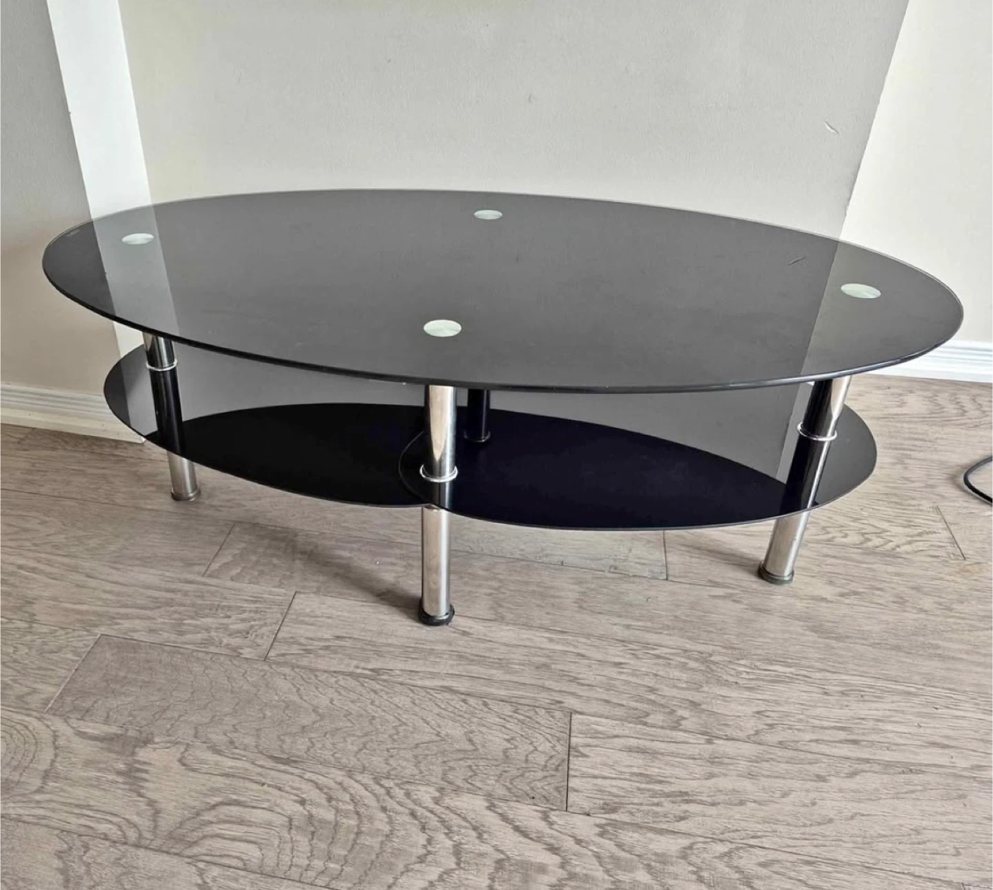 This oval coffee table has a black glass top and a second black glass shelf. It's supported by sleek chrome legs. It's a stylish addition to any living room!