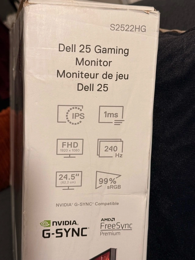 Level up competitive play with the Dell S2522HG 25" Fast IPS gaming monitor. Enjoy Full HD clarity at up to 240Hz with 1ms GtG (Extreme) for smooth motion, plus NVIDIA G-SYNC Compatible and AMD FreeSync Premium support. Ergonomic stand with height/tilt/swivel/pivot and built-in USB hub keep your setup dialed in. Currently Retails at $599 CAD, selling it for $250 CAD OBO. Can drop off for an additional fee.