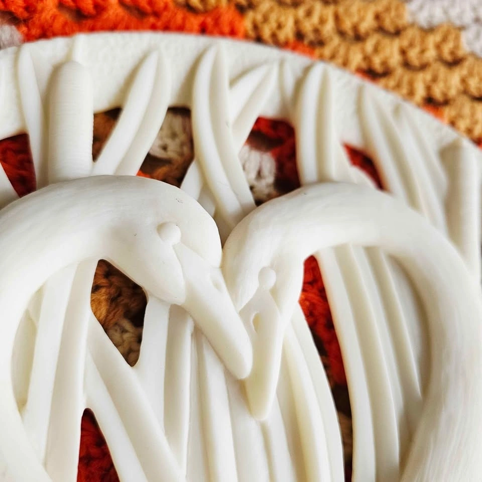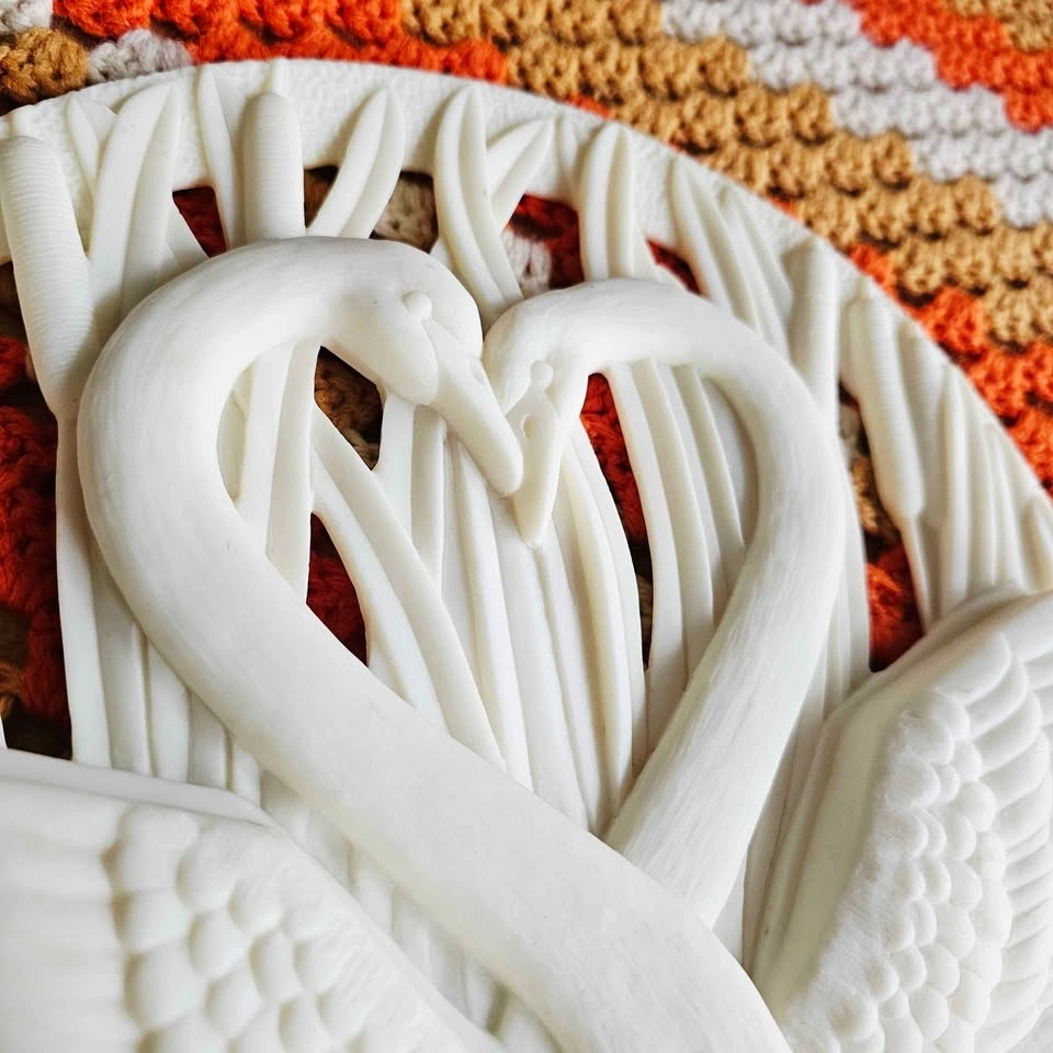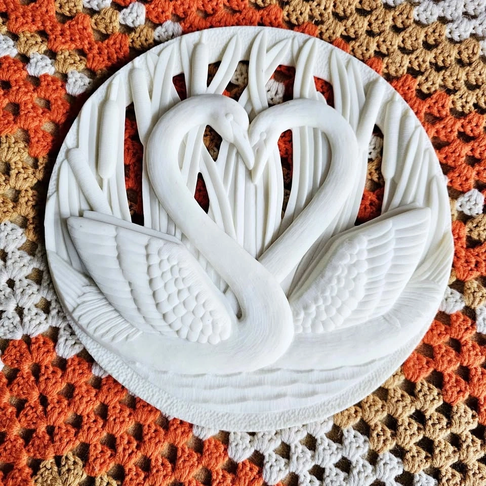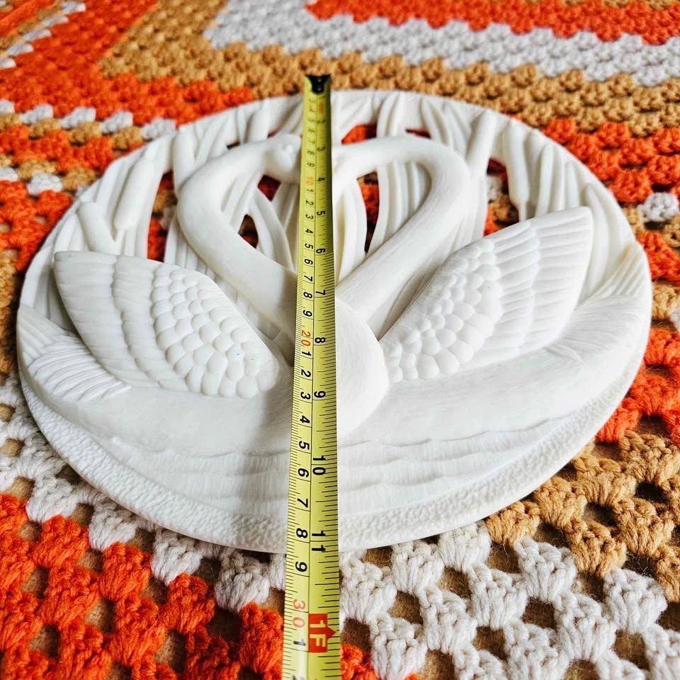 Beautiful vintage 1970s handcrafted 3D sculpture decor piece from Coralei Hawaii, made of ivory/ cream cultured coral. Sculpture features a graceful design of two 'lovebird' swans in water, surrounded by cattails, holding their necks in the shape of a heart.