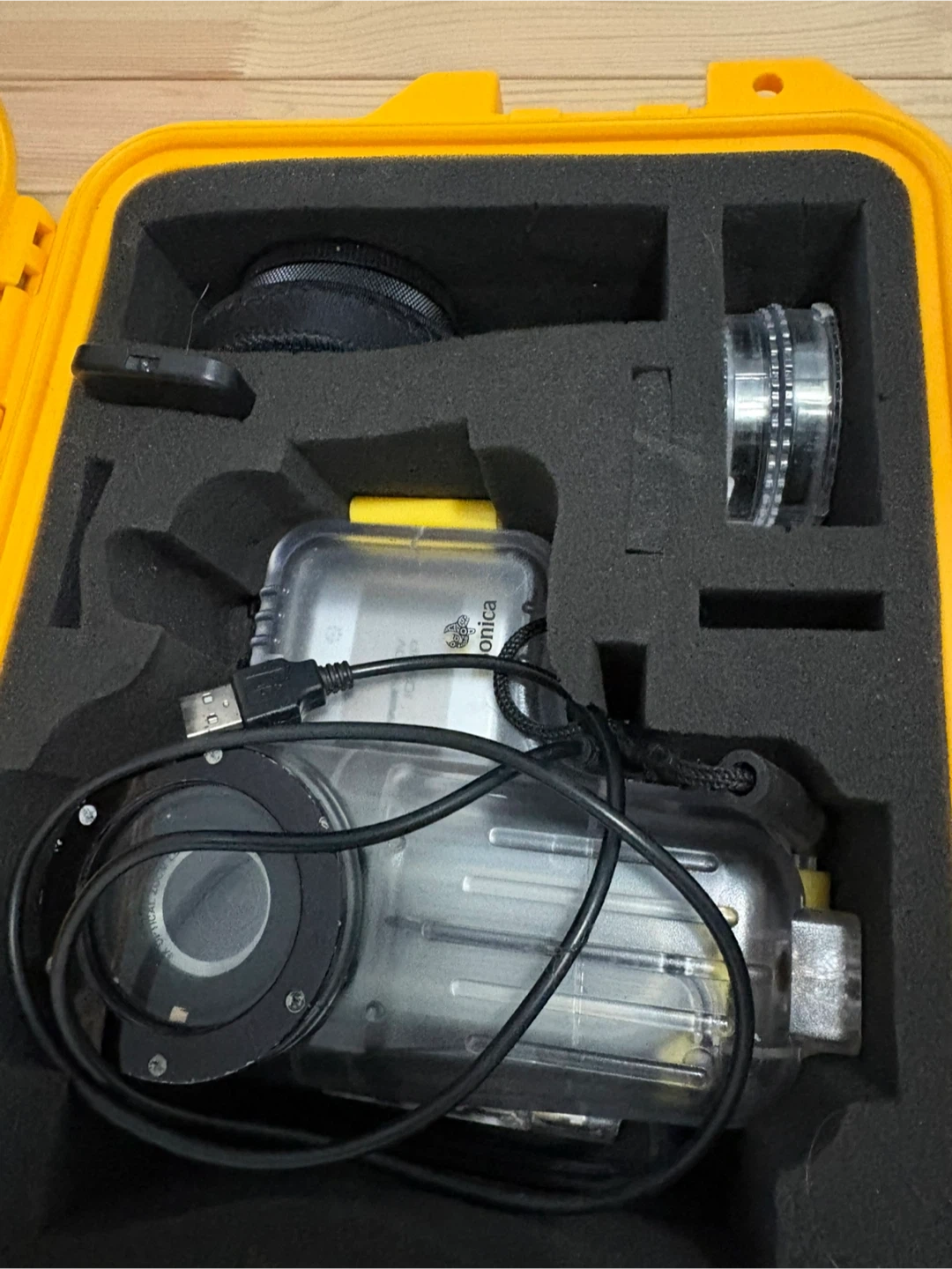 This is a Bonica underwater camera housing. It comes with a protective case and various accessories. It's designed for capturing photos and videos underwater.