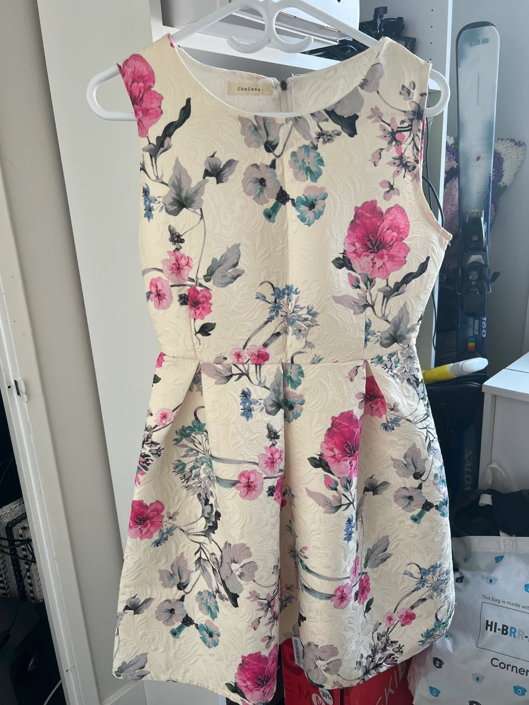 A sleeveless floral dress with a cream base and a vibrant print. It has a textured fabric and a flattering A-line cut. Zipper closure at the back.