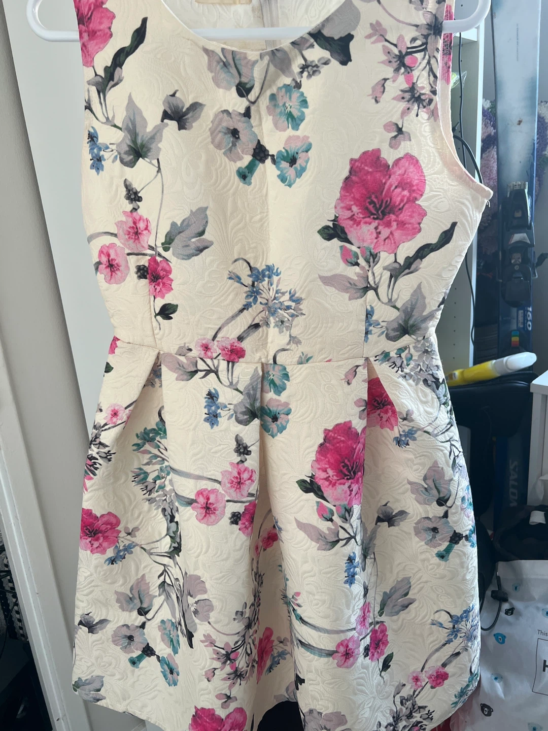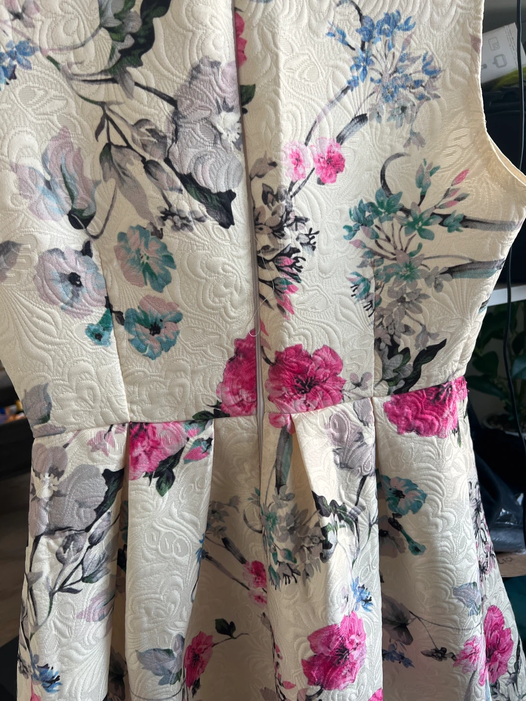 A sleeveless floral dress with a cream base and a vibrant print. It has a textured fabric and a flattering A-line cut. Zipper closure at the back.