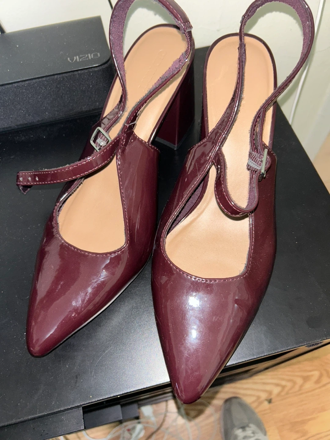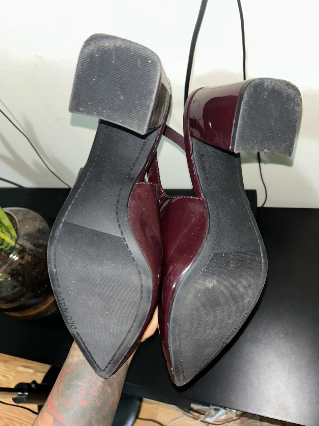 These burgundy patent slingback heels are from Old Navy. They have a pointed toe and an adjustable ankle strap. Chunky block heel provides comfortable height. im size 9 i get a 10 because they run small