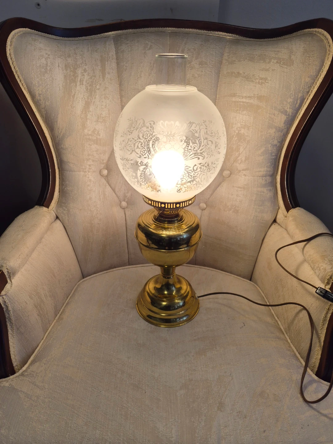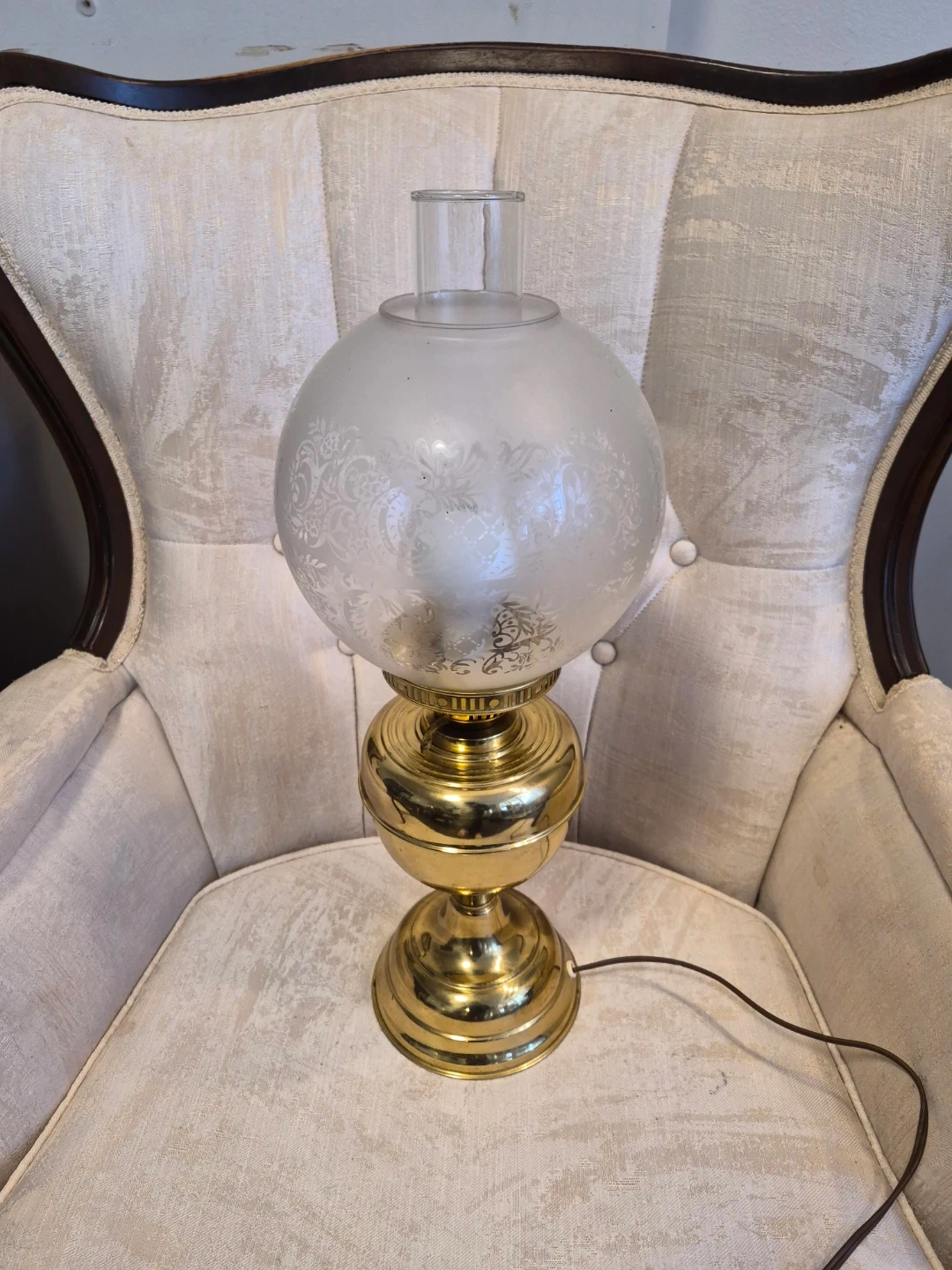 This table lamp has a decorative etched glass globe and a brass base. It's designed to resemble a vintage oil lamp. The frosted glass shade is etched with a floral pattern.