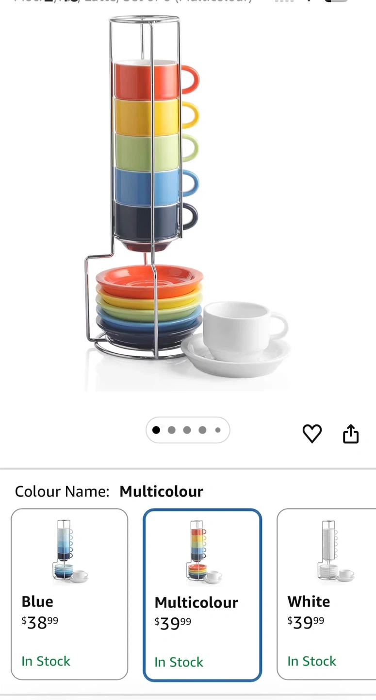 Six stackable porcelain demitasse cups with matching saucers in a metal stand. Cups are 2.5oz capacity. They come in a multicolour set. Porcelain material.
