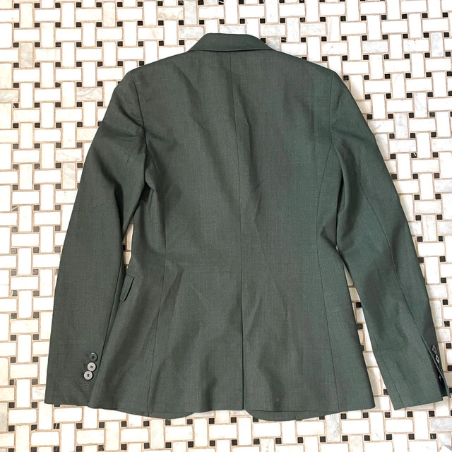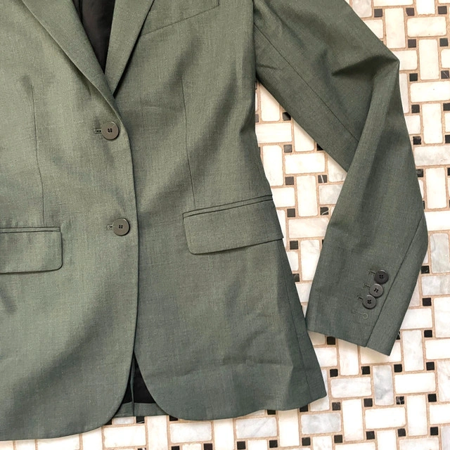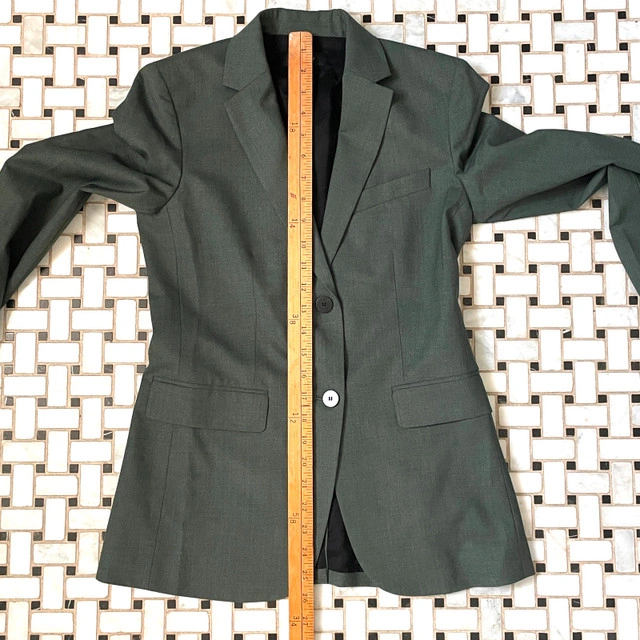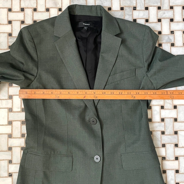 NEW Theory Classic Blazer in beautiful Stretch Wool - Olive/Gray-Size 00. This is their classic single-breasted Blazer is designed with notch lapels, flap pockets and two-button closure with back vent. Greenish/Grayish colour. Fully lined. 96% wool, 4% Elastane. Lining is 100% Cupro. This is NEW without tag. See picture that shows that back slit is still stitched together. Showing a stock picture of same style jacket in different fabric - just to show how it looks. Measurements lying flat: Pit to pit: 16" Length: 26". Selling for $125. Available for pick up in the Broadview/Danforth area. Contact-free porch pick up. Check out my other great stuff!