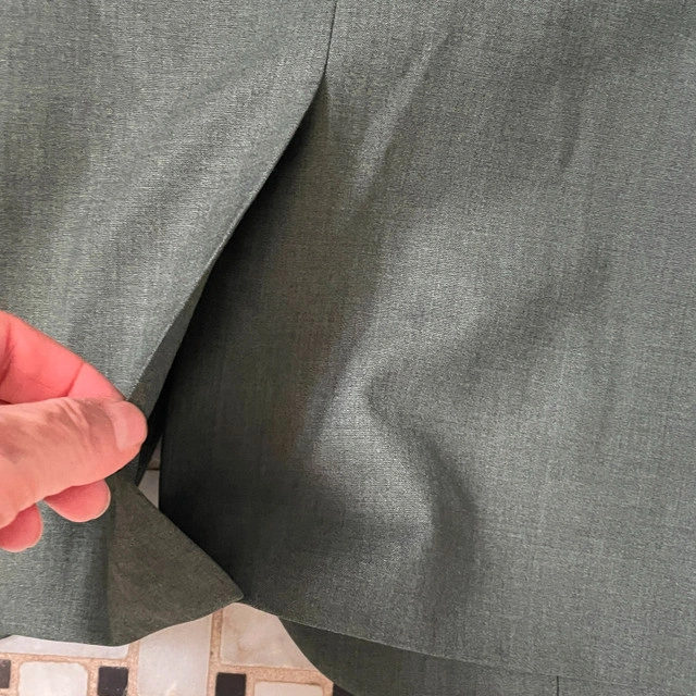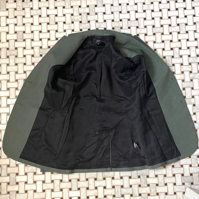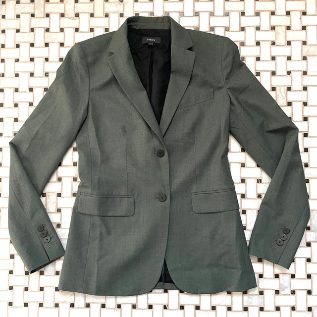 NEW Theory Classic Blazer in beautiful Stretch Wool - Olive/Gray-Size 00. This is their classic single-breasted Blazer is designed with notch lapels, flap pockets and two-button closure with back vent. Greenish/Grayish colour. Fully lined. 96% wool, 4% Elastane. Lining is 100% Cupro. This is NEW without tag. See picture that shows that back slit is still stitched together. Showing a stock picture of same style jacket in different fabric - just to show how it looks. Measurements lying flat: Pit to pit: 16" Length: 26". Selling for $125. Available for pick up in the Broadview/Danforth area. Contact-free porch pick up. Check out my other great stuff!