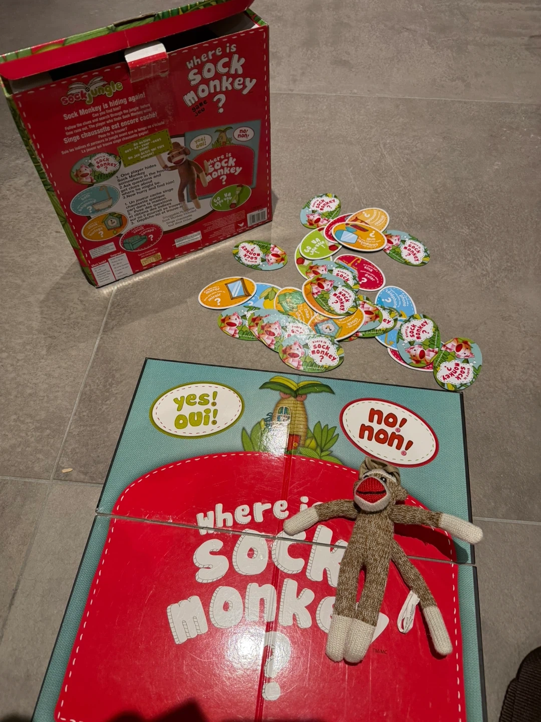 This is the Sock Jungle 'Where is Sock Monkey?' board game. It includes the main game board, the sock monkey figure, and multiple clue tokens. Fun for kids to play hide and seek with the sock monkey!