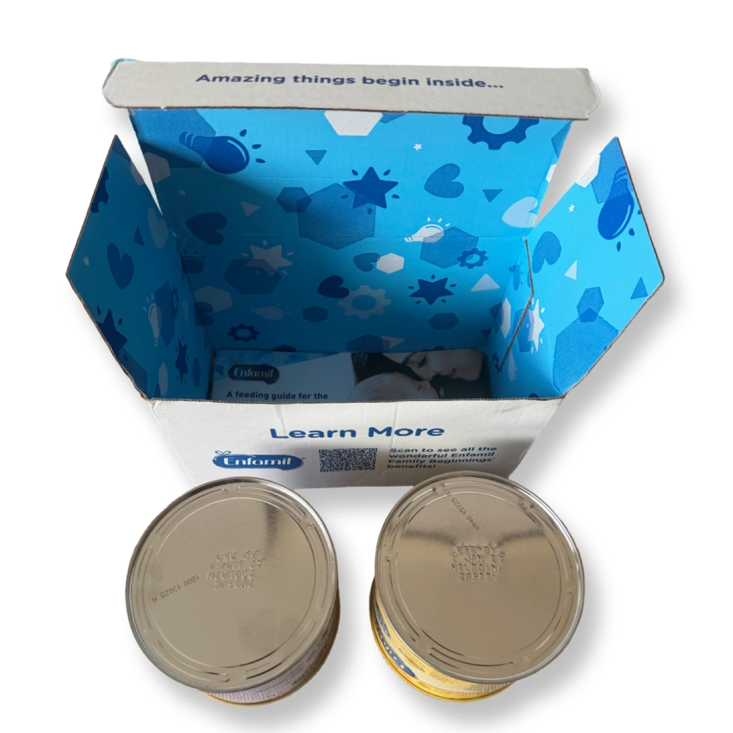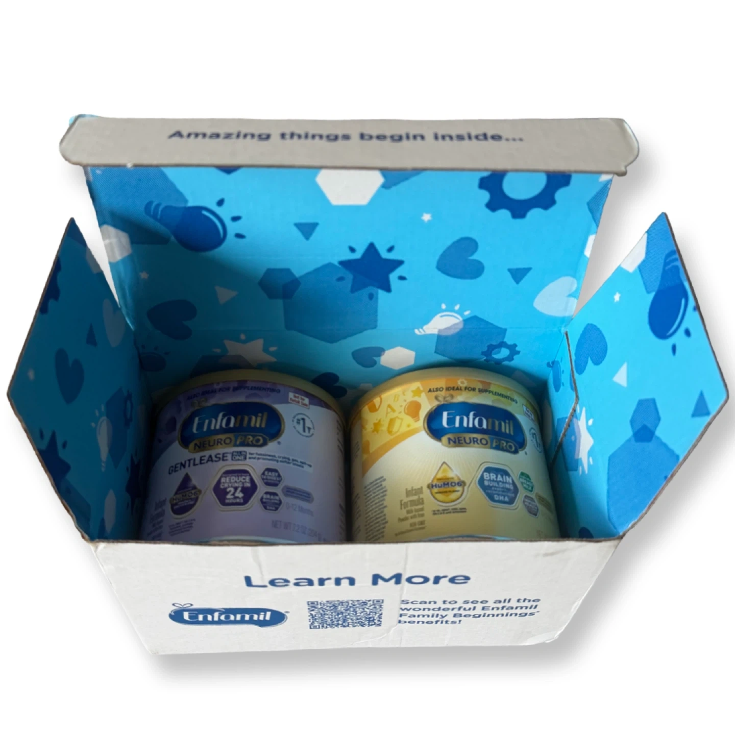 Enfamil Wonder Box with 2 sealed formula cans: NeuroPro Gentlease and NeuroPro Infant. Box opened for photos only.