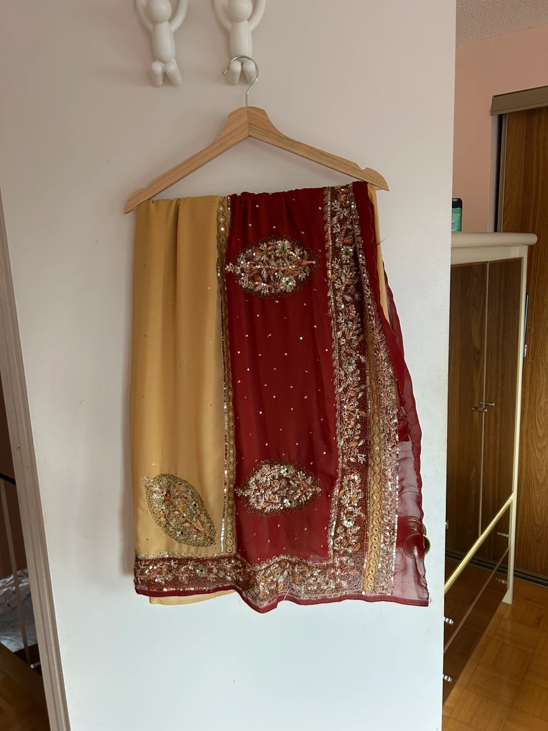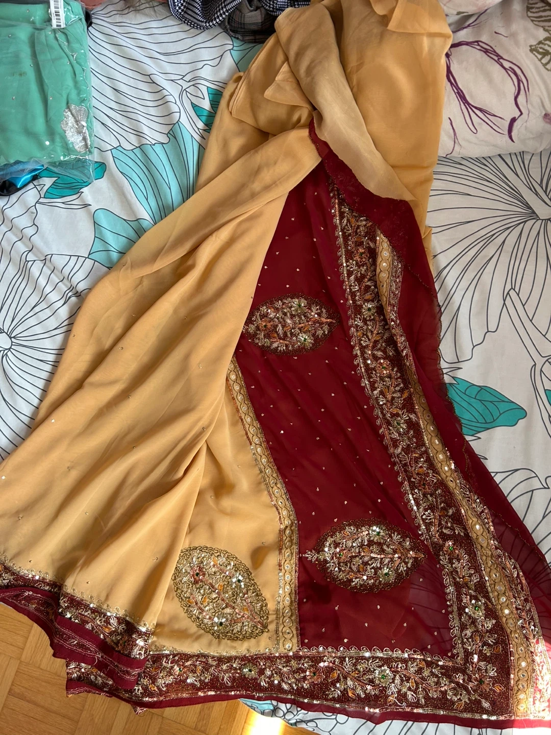 Beautifully embellished saree in a rich burgundy and gold colour combination. Features intricate beadwork and sequin detailing along the borders and scattered motifs throughout. Perfect for special occasions and cultural events! Light chiffon material, but feels heavy because of the beadwork and sequins.