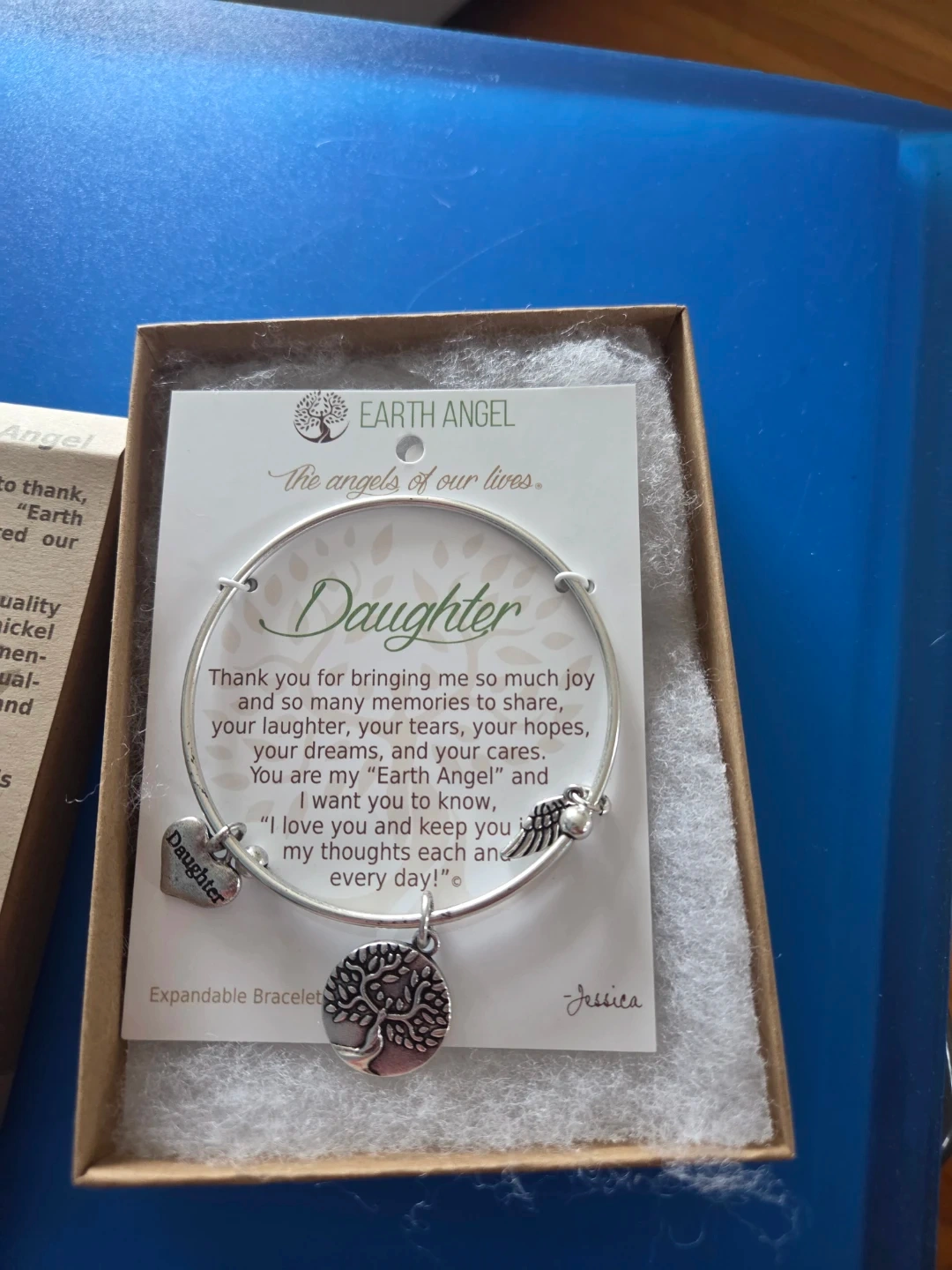 This Earth Angel expandable charm bracelet is designed for daughters. It features a "Daughter" charm, a tree of life charm, and a wing charm. The bracelet is adjustable and comes in its original box, making it a thoughtful gift.