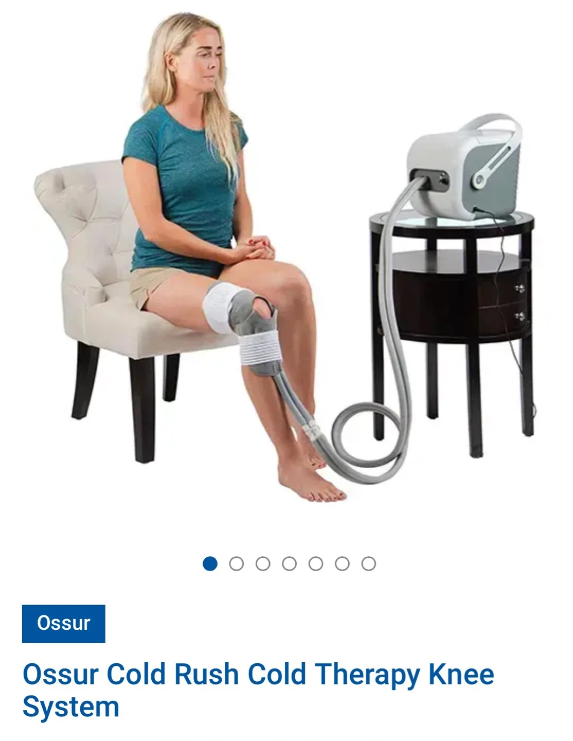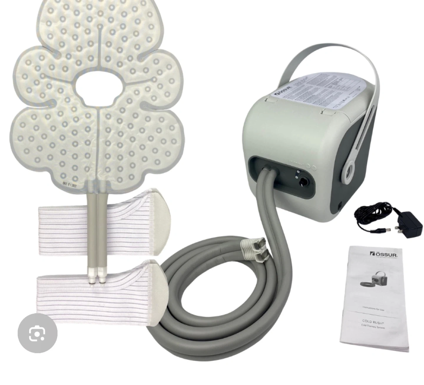 This Ossur Cold Rush system delivers cold therapy with a durable motor and strong flow rate. It's quiet and compact, weighing just 4.6 lbs. Includes the motorized device, pad, hoses, and power adapter. This is useful for pain relief and recovery.