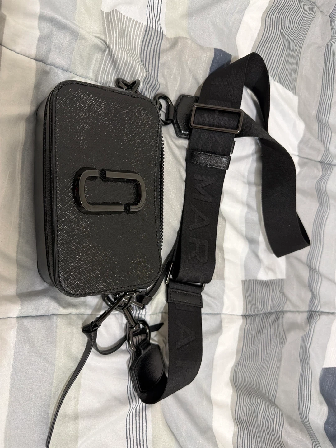 This is a black Marc Jacobs Snapshot camera bag. It's made of textured leather with a shiny black double J logo. It comes with a wide, adjustable strap that says "MARC JACOBS" all over it.