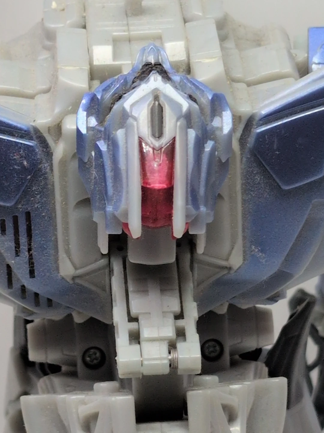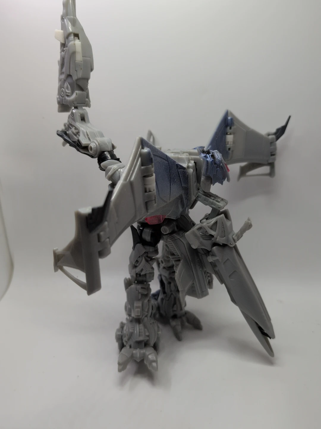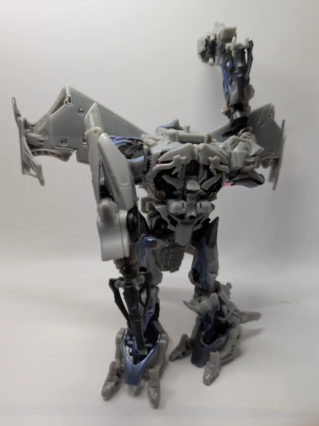 This is a grey and blue Transformers robot action figure. It's made of plastic and has intricate detailing. This toy is great for fans of the Transformers franchise who enjoy collecting action figures. Height about 15" width about 13"