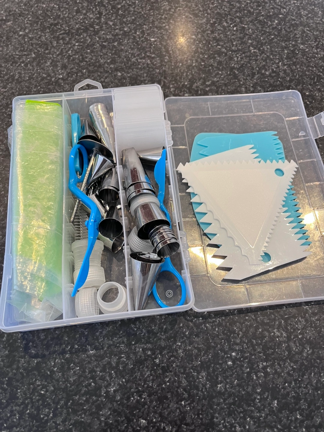 Complete cake decorating set! It includes various piping tips, couplers, decorating bags, and smoothing tools. Everything is neatly organized in a plastic storage box. Perfect for anyone who loves to bake and decorate cakes!