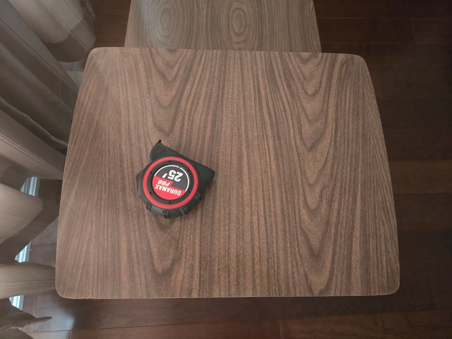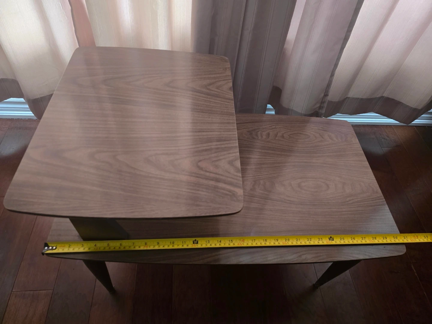 This vintage tiered side table features a wood-grain laminate finish. It's a two-tier design with tapered legs. The larger surface measures approximately 25 inches wide.