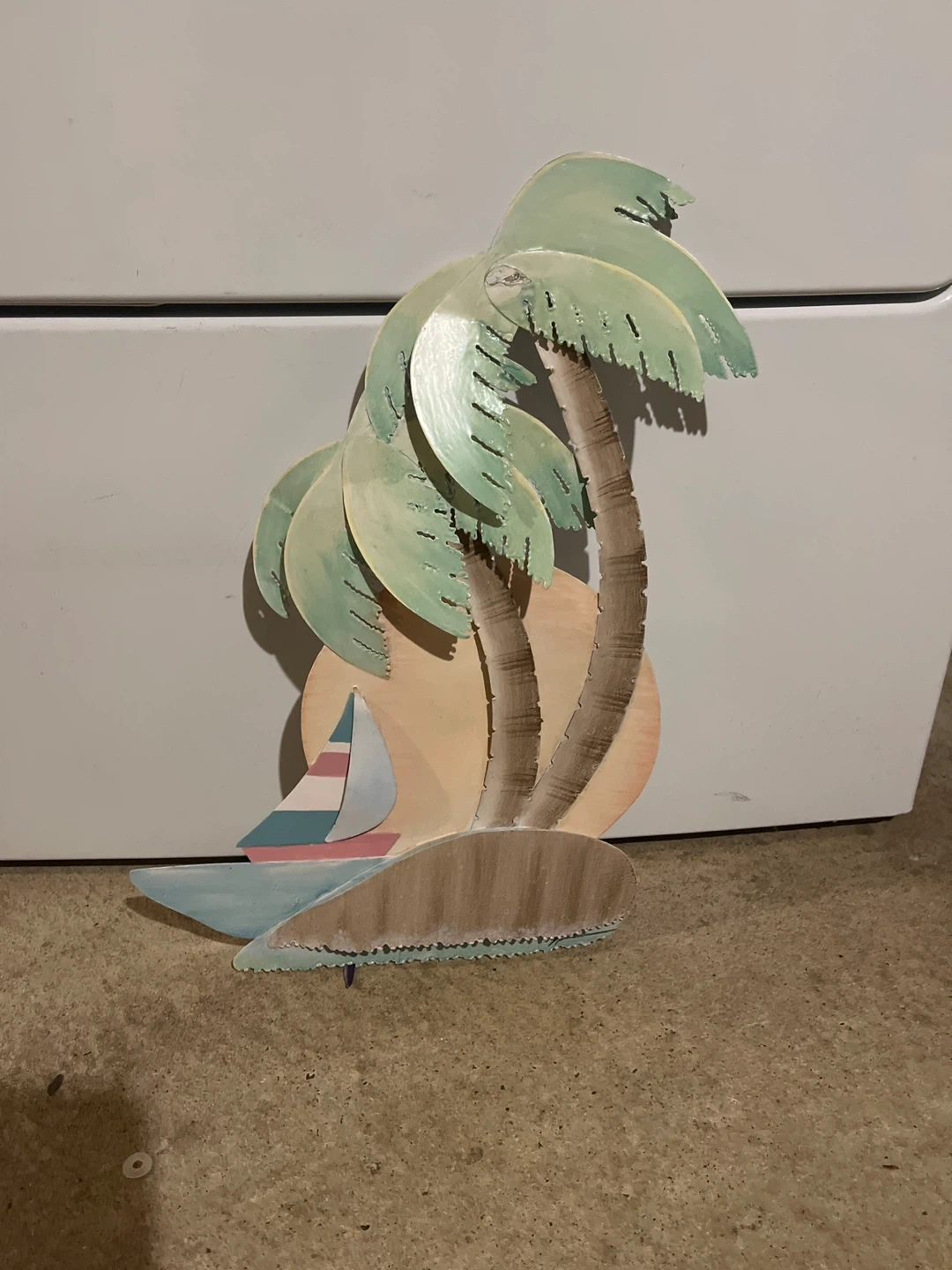 This charming metal wall decor piece features a tropical scene with palm trees, a sailboat, and a sunset. It's crafted from metal and hand-painted with pastel colors. It adds a touch of coastal flair to any room!