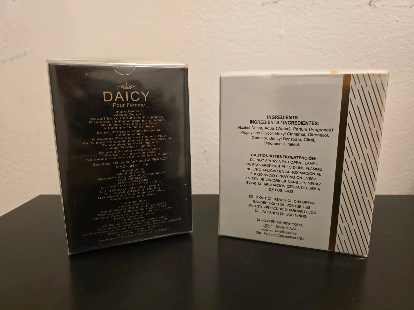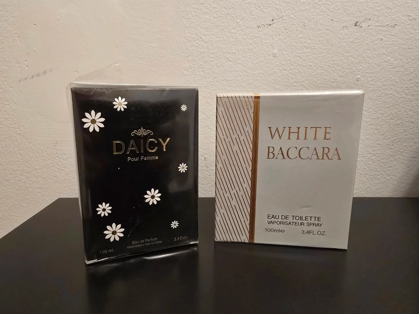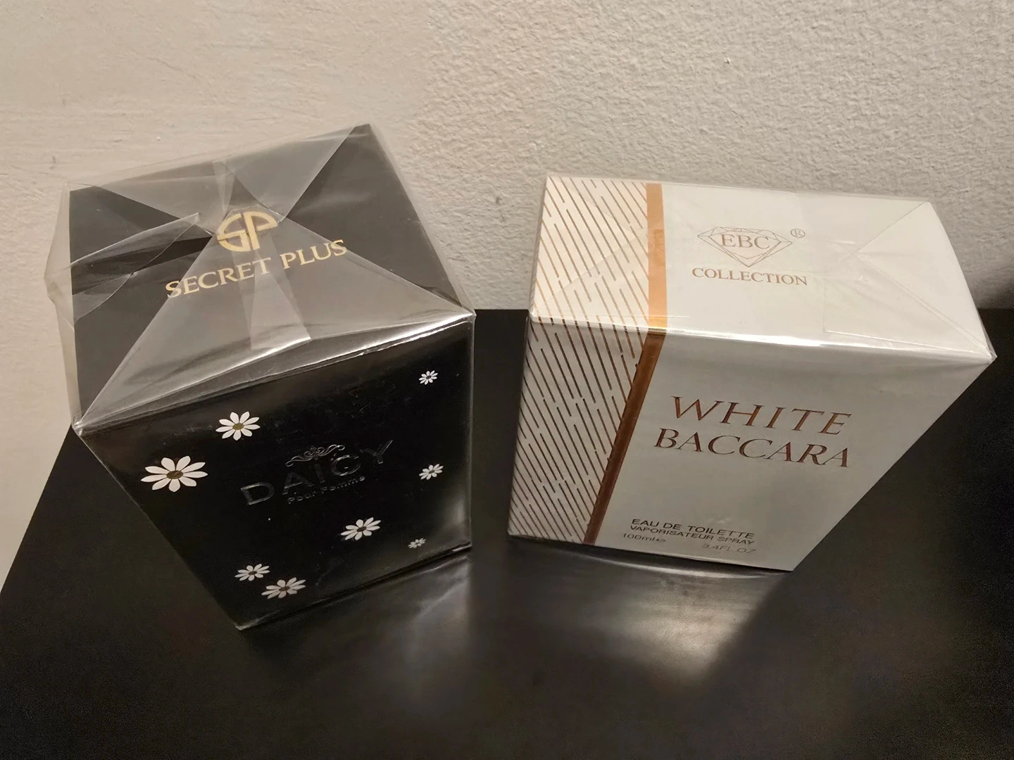 Includes EBC Collection White Baccara Eau de Toilette Vaporisateur Spray 100ml and DAICY Pour Femme Eau de Parfum 100ml secret plus. Both are full-size bottles and come in original boxes. Perfect for gifting or personal use!