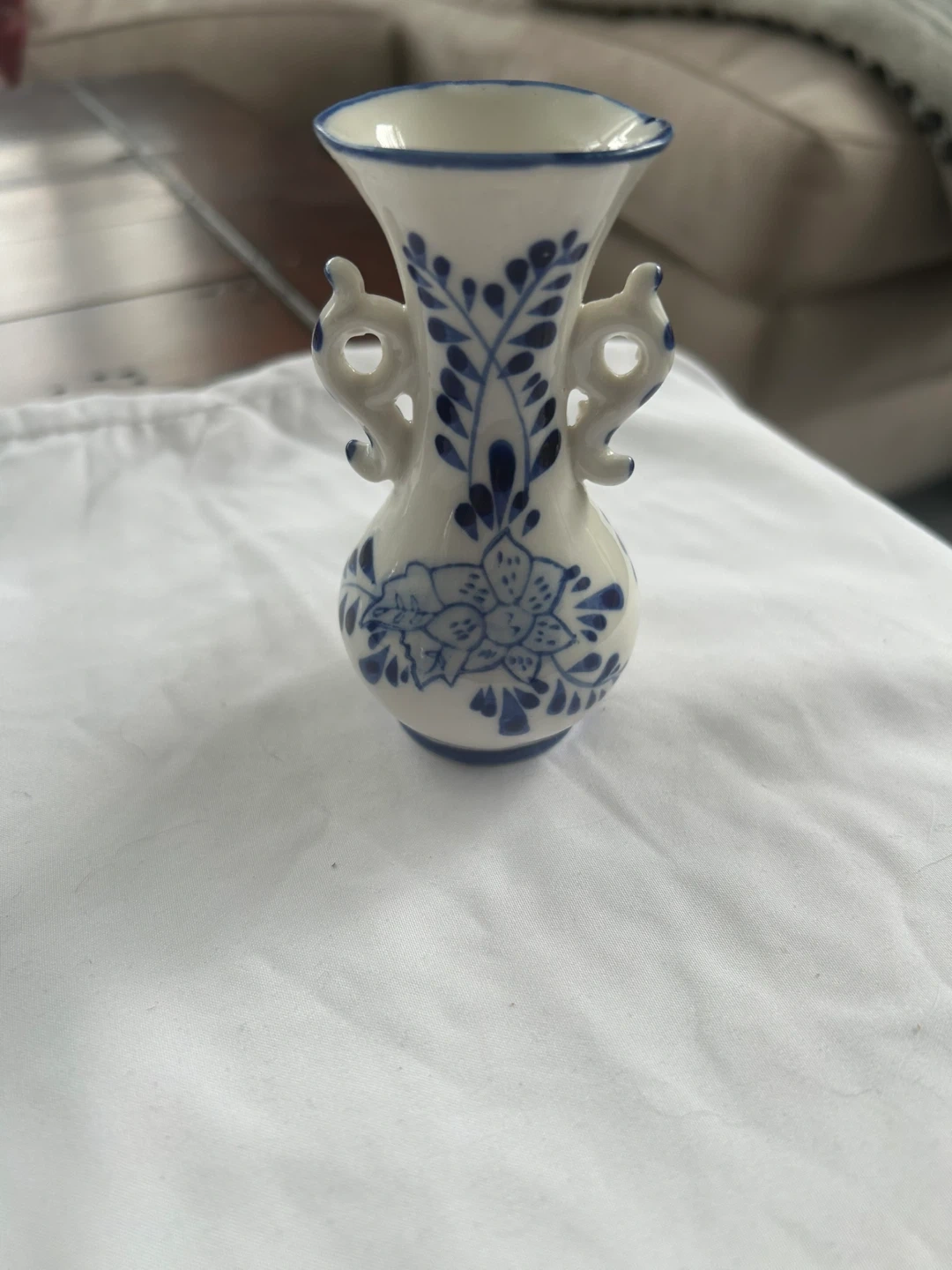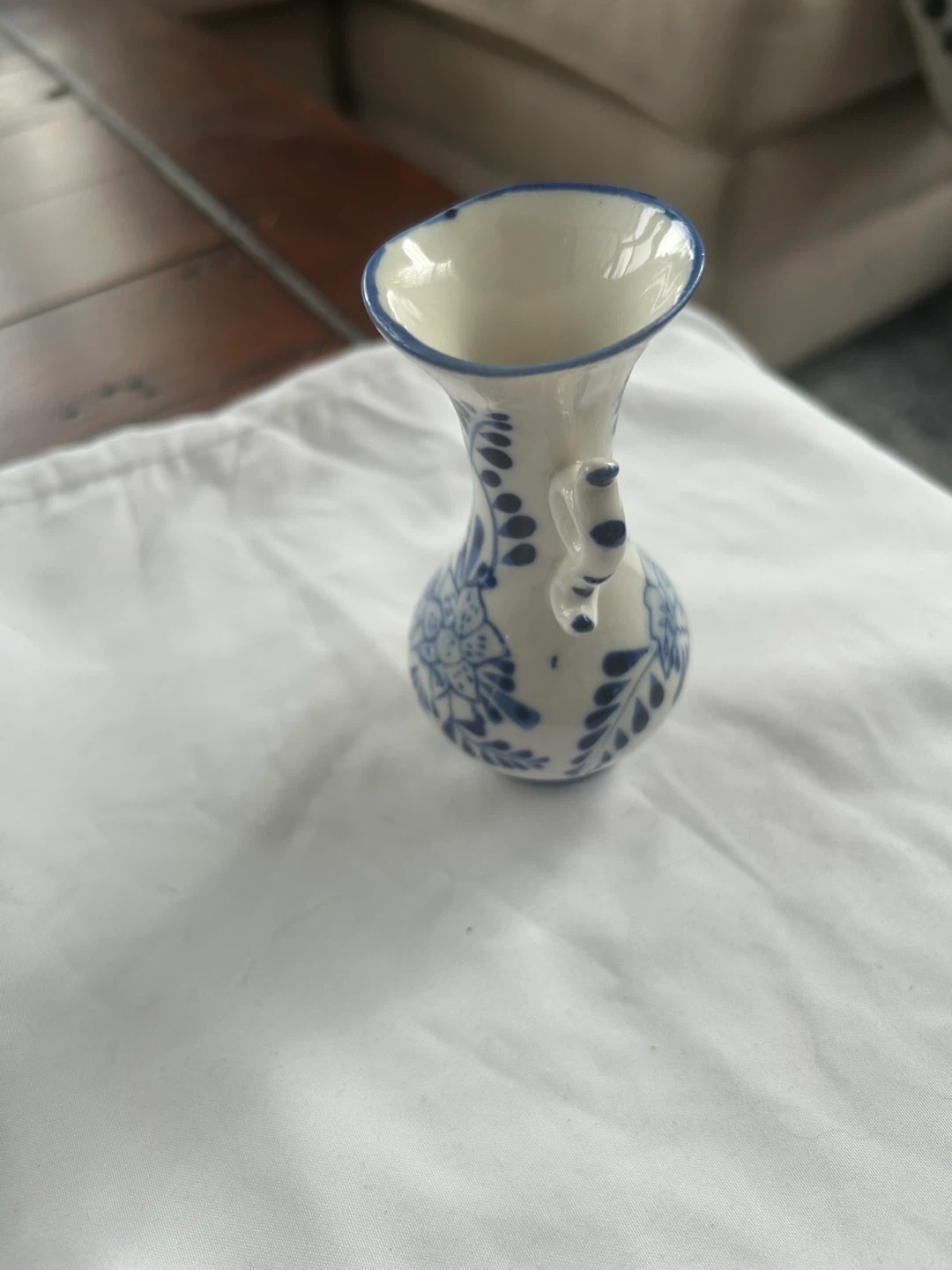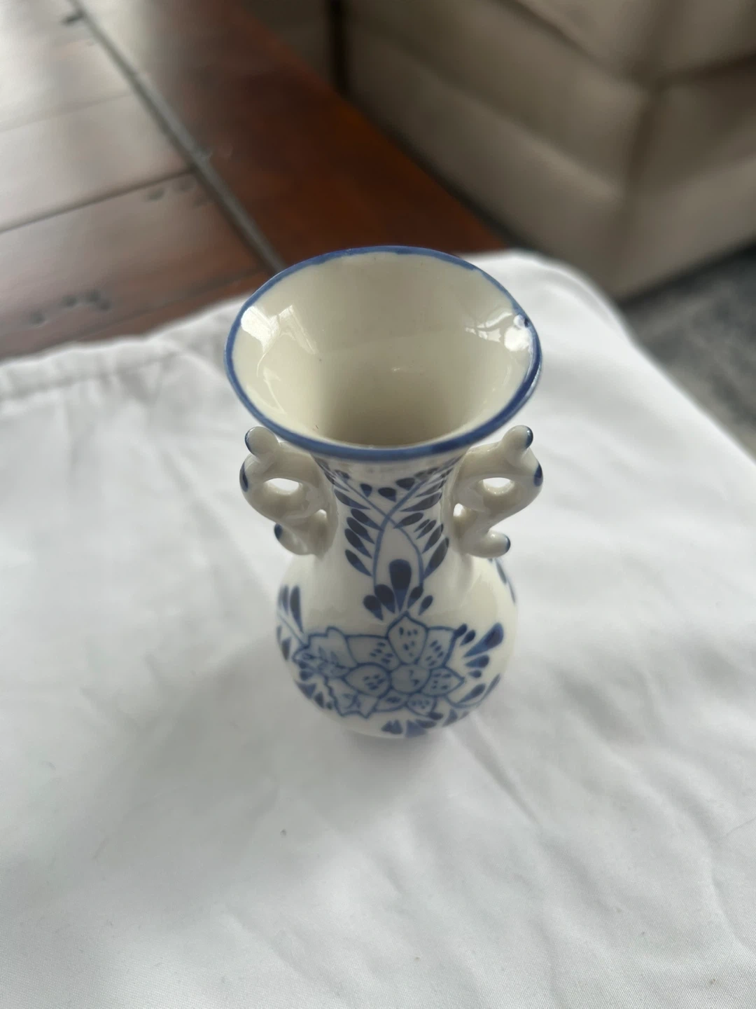 This is a sweet little ceramic /pottery vase with a blue and white floral design. It's perfect for a single flower or as a decorative accent piece. The vase has two small ornate handles on the sides.4” tall