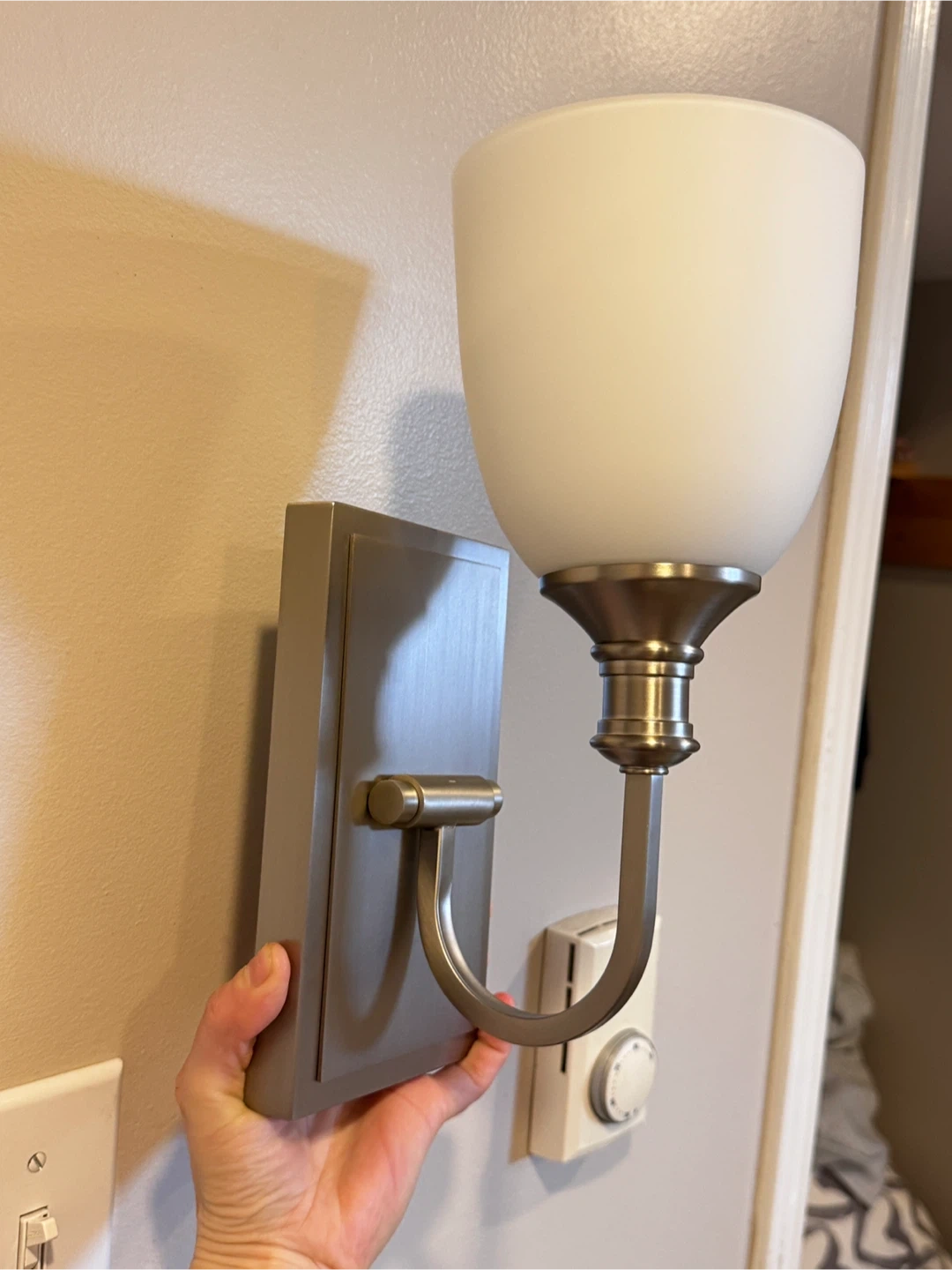 This elegant wall sconce features a brushed satin nickel finish and a frosted glass shade. It's designed for easy installation and provides a warm, inviting glow. Perfect for hallways, bedrooms, or entryways.