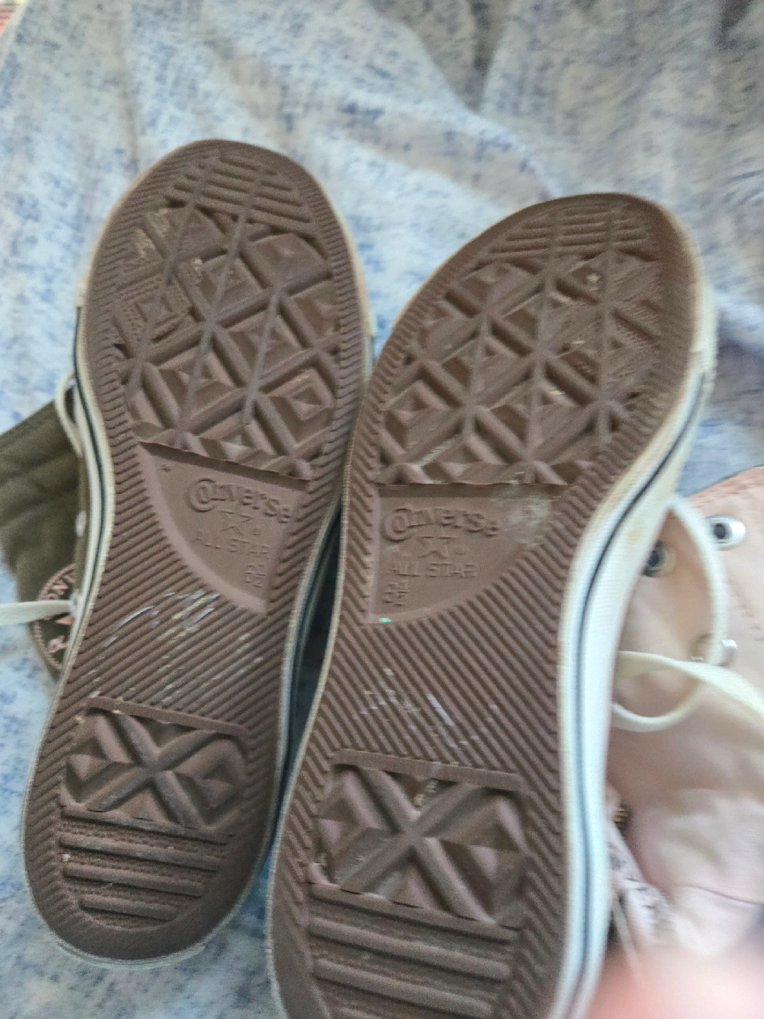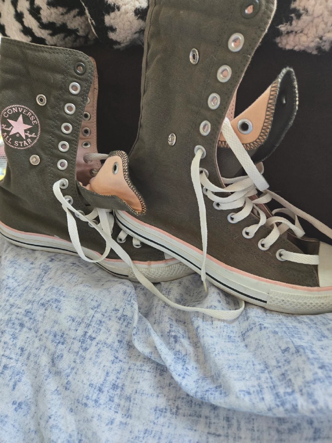 Selling a pair of Converse All Star high-top sneakers! They're a cool olive green colour with a pink accent. These classic sneakers are in good condition and ready for a new home