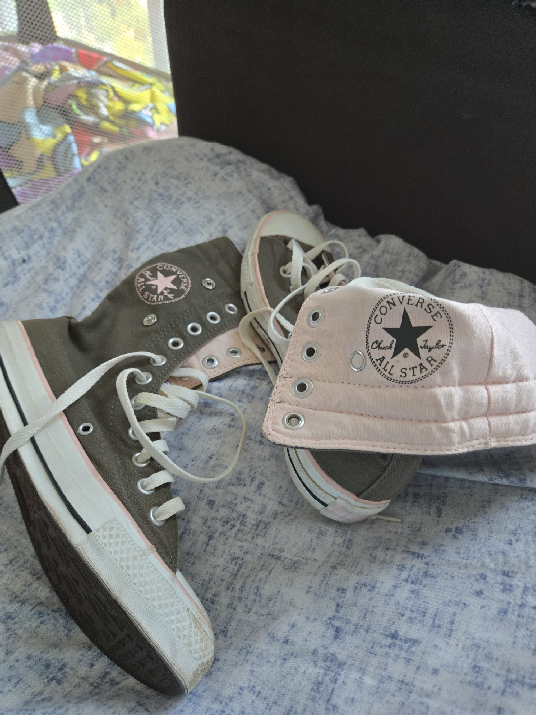 Selling a pair of Converse All Star high-top sneakers! They're a cool olive green colour with a pink accent. These classic sneakers are in good condition and ready for a new home