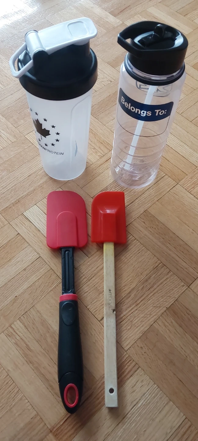 Includes a white protein shaker bottle with black lid and a clear water bottle with a black lid. Also comes with two spatulas, one red and black, and one red with a wooden handle. The wooden handled spatula has 'Macy's' printed on it.