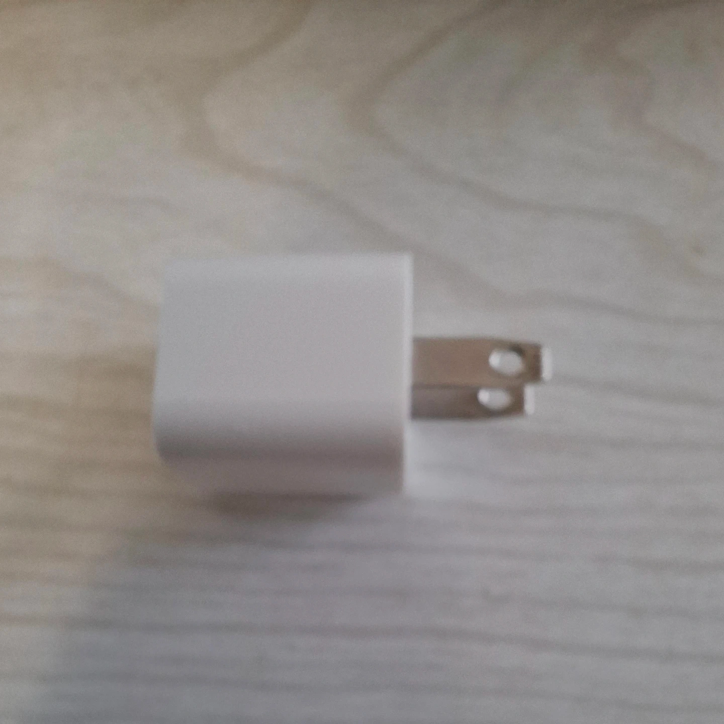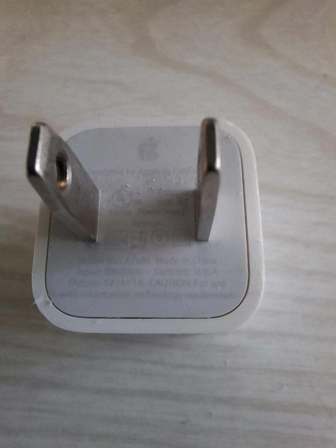 Apple USB Power Adapter, model A1385. Input 100-240V, output 5V--1A. Designed by Apple in California. Made in China. It's a standard USB power adapter for charging devices.