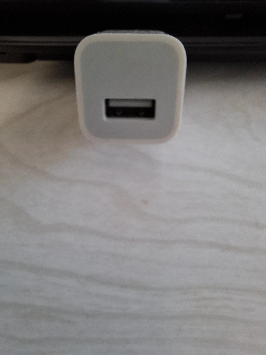 Apple USB Power Adapter, model A1385. Input 100-240V, output 5V--1A. Designed by Apple in California. Made in China. It's a standard USB power adapter for charging devices.