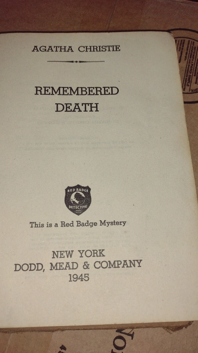 This is a 1945 first edition copy of "Remembered Death" by Agatha Christie, published by Dodd, Mead & Company in New York. Condition is used, fair. Cash and cashless payments are accepted. Available for curbside pickup.