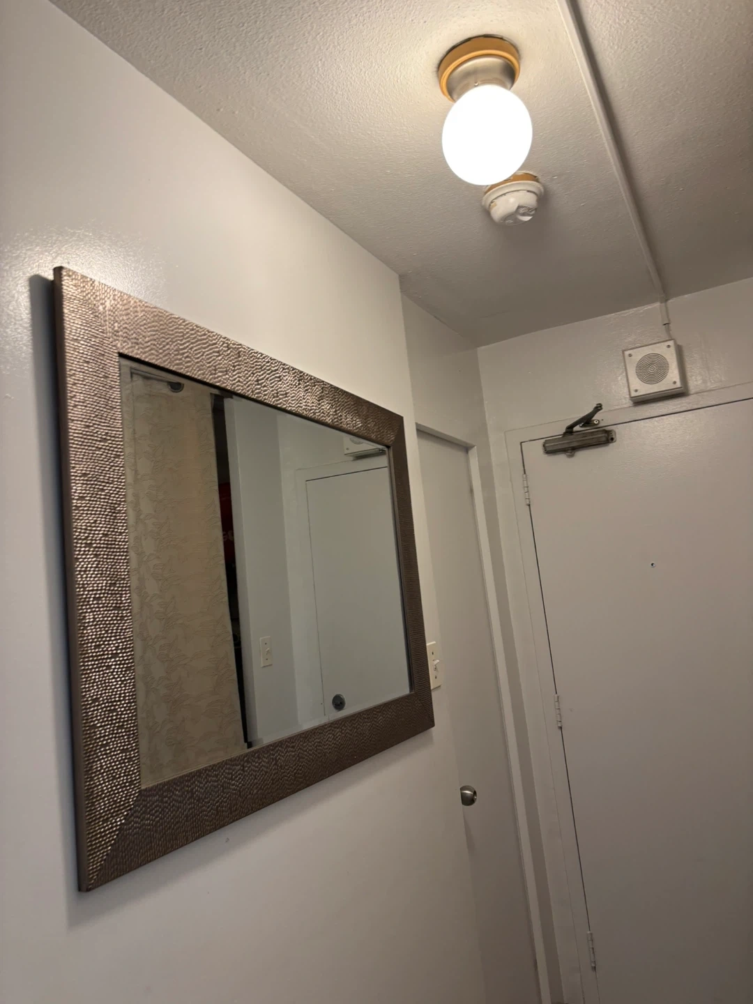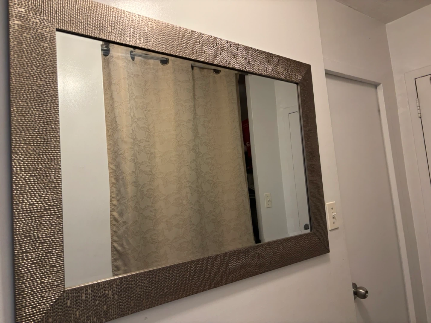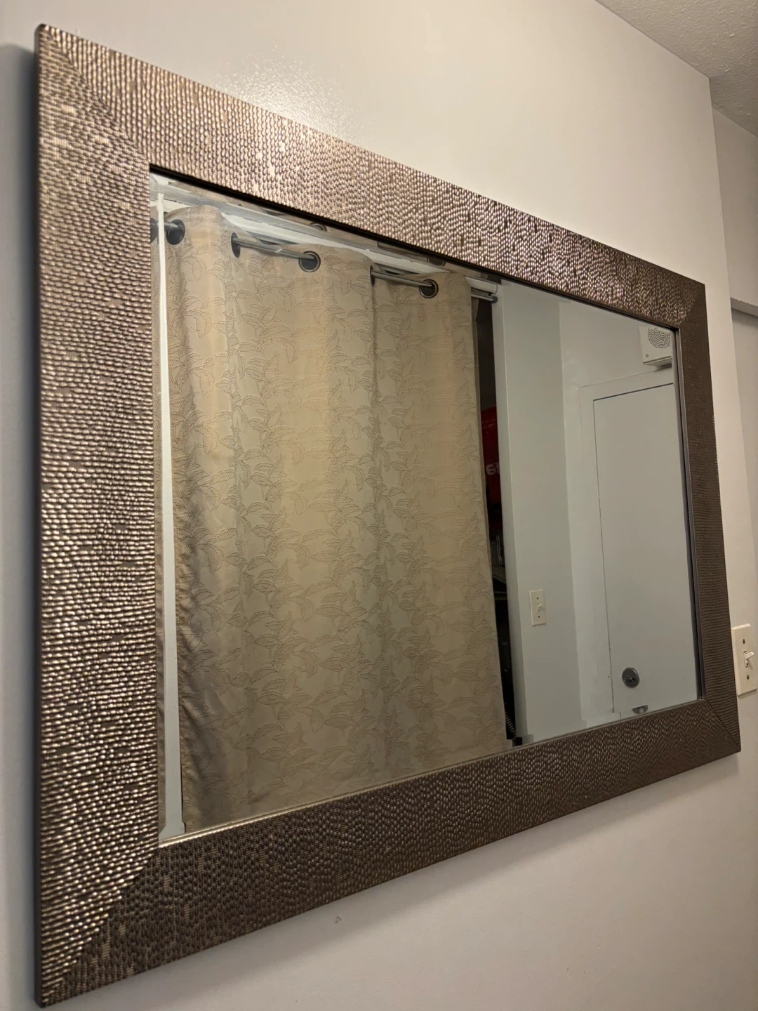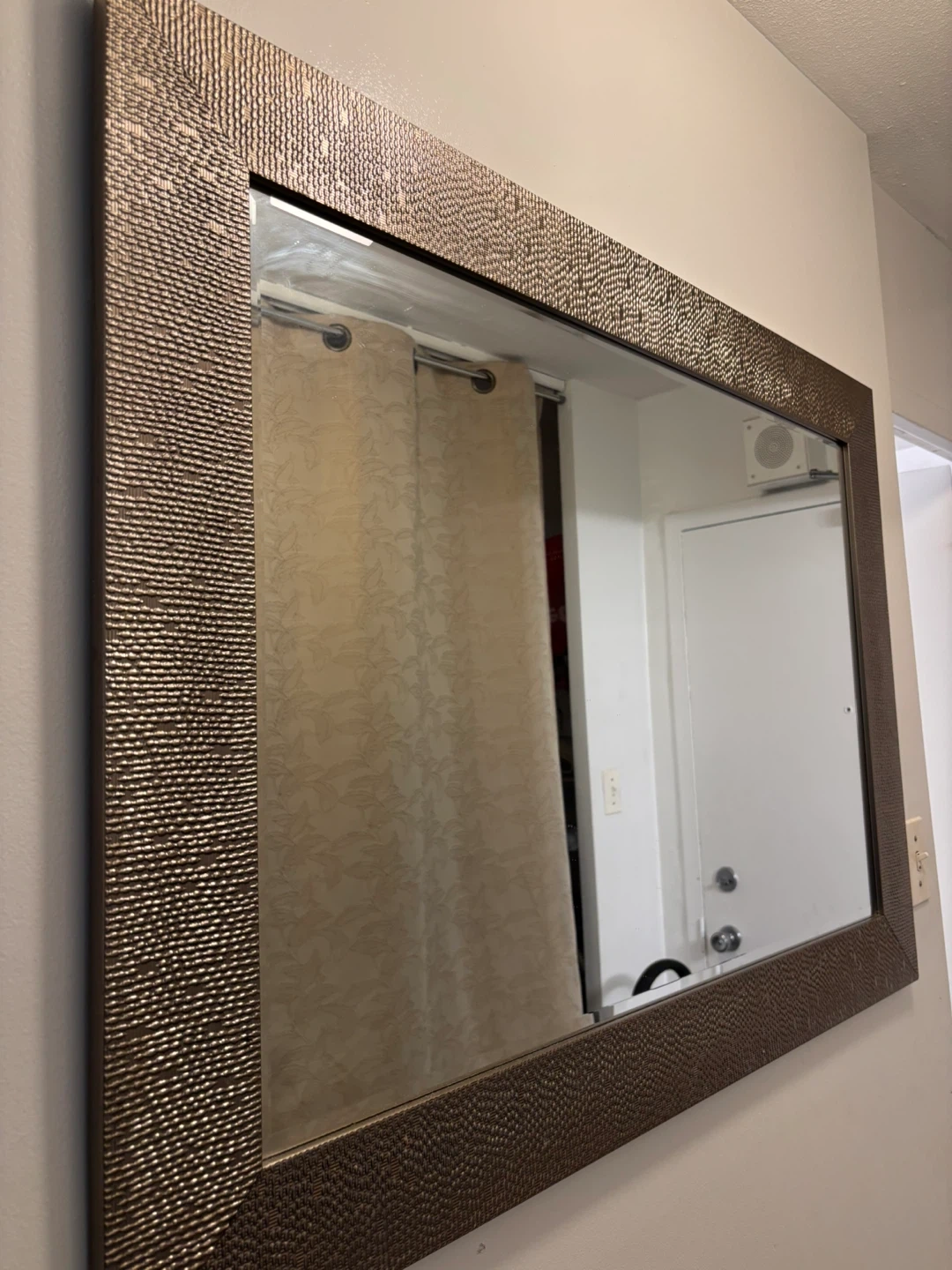 This decorative mirror features a unique textured bronze-coloured frame. It's a great size for an entryway or living space. It would add a stylish touch to any room! Stylish mirror, looks Very decorative and aesthetic along with servimg purpose. Move out sale