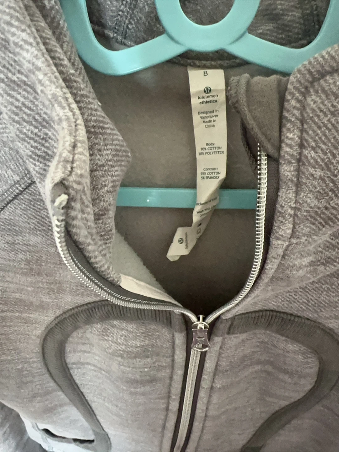 This Lululemon zip-up hoodie is grey with darker grey contrast panels. It's a size 8 and made from a blend of cotton and polyester. The body is 70% cotton and 30% polyester, while the contrast is 95% cotton and 5% spandex. It's a comfortable layer for casual wear.