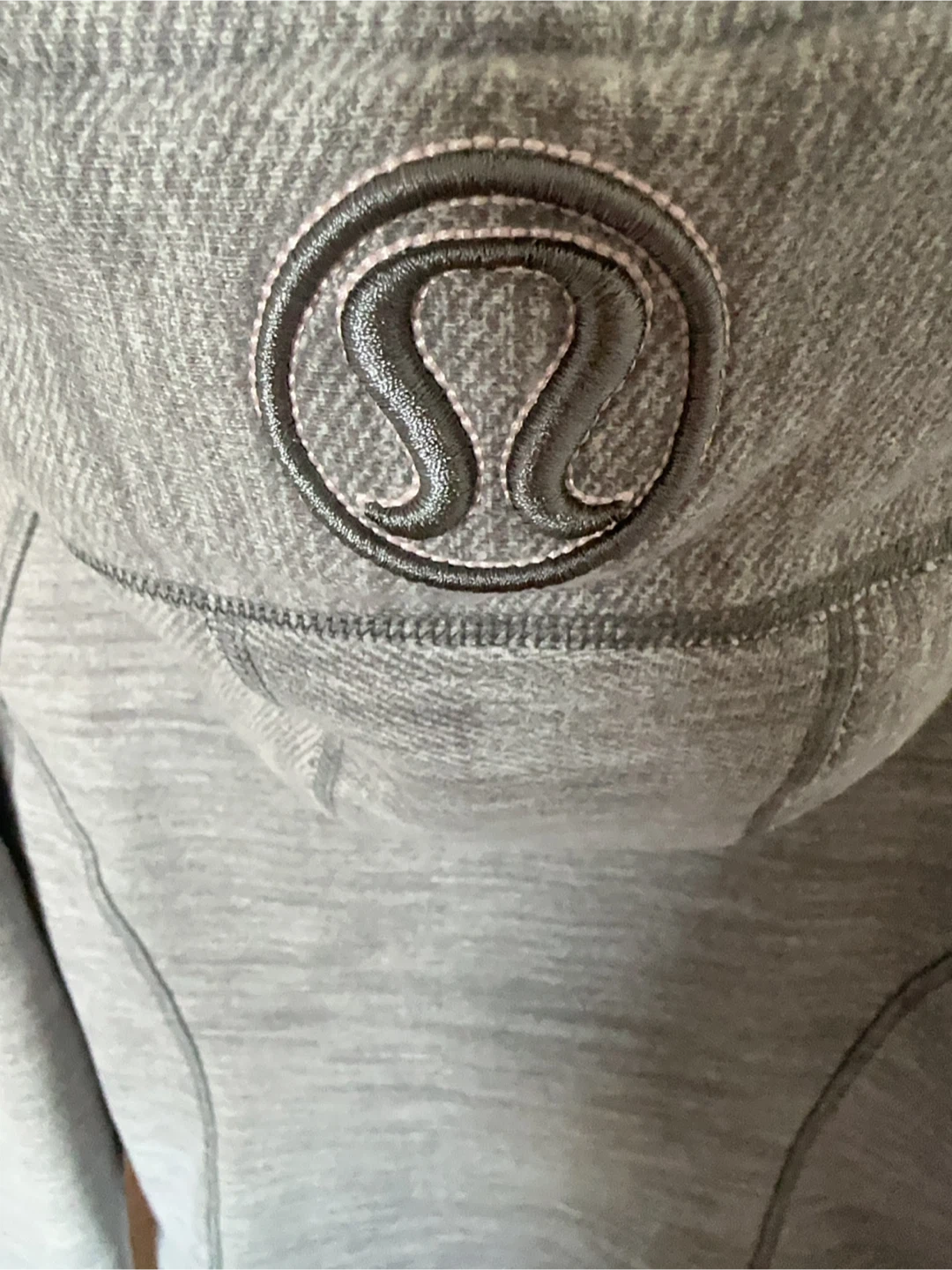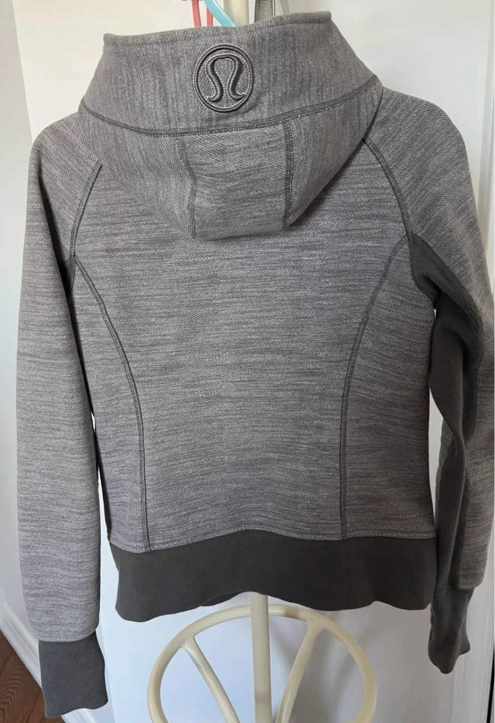 This Lululemon zip-up hoodie is grey with darker grey contrast panels. It's a size 8 and made from a blend of cotton and polyester. The body is 70% cotton and 30% polyester, while the contrast is 95% cotton and 5% spandex. It's a comfortable layer for casual wear.