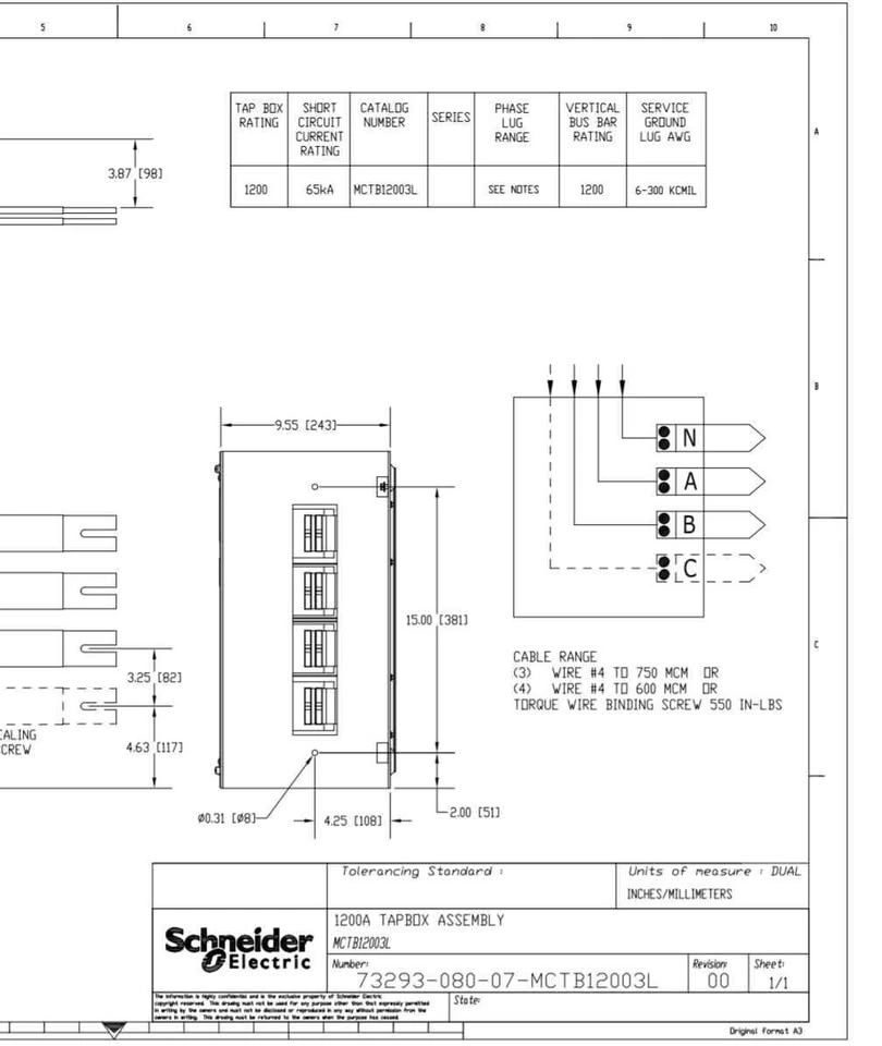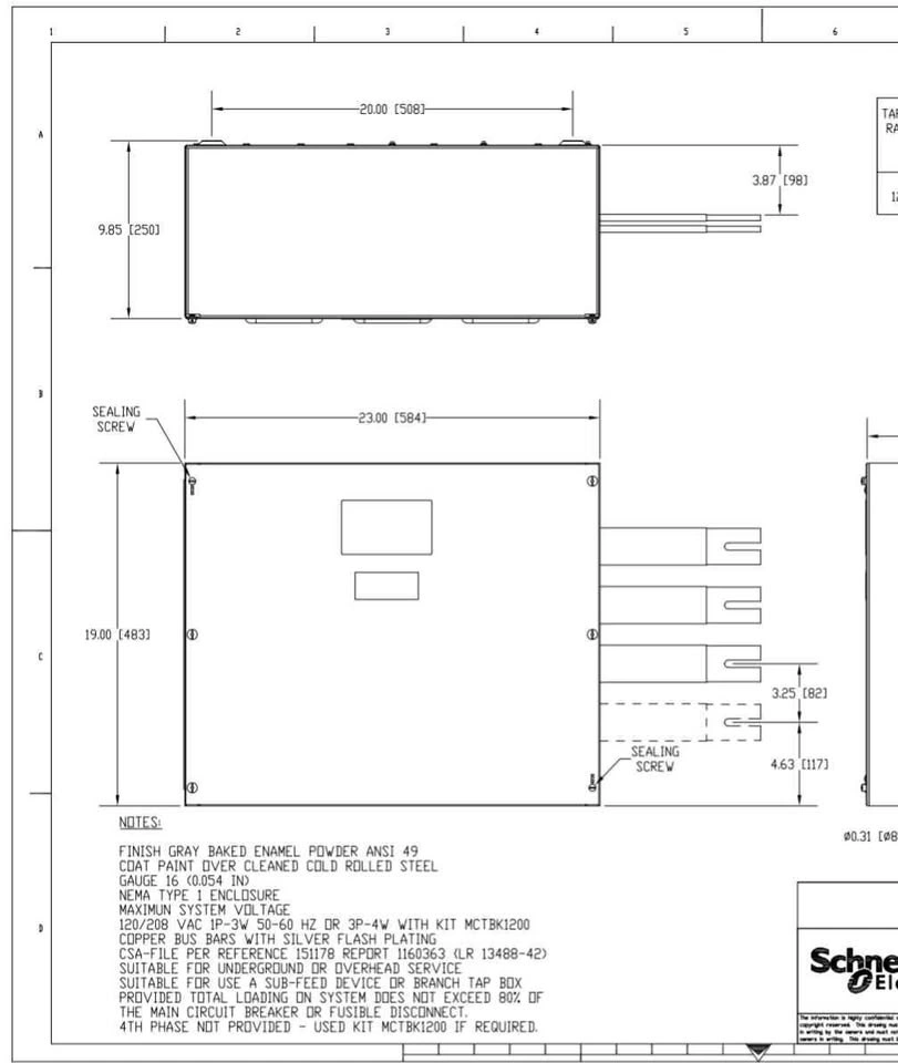 New in box, never opened. Model MCTB12003L. Main cable tap box by SQUARE D by Schneider Electric. I found drawings for it online and have added screenshots.