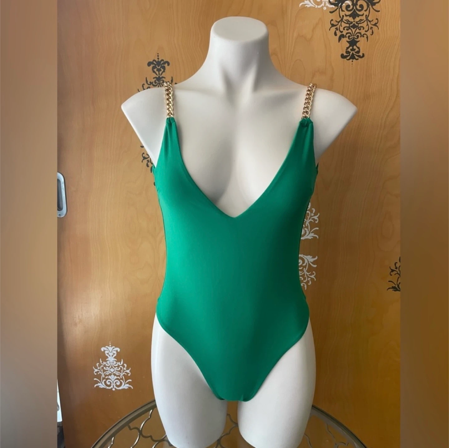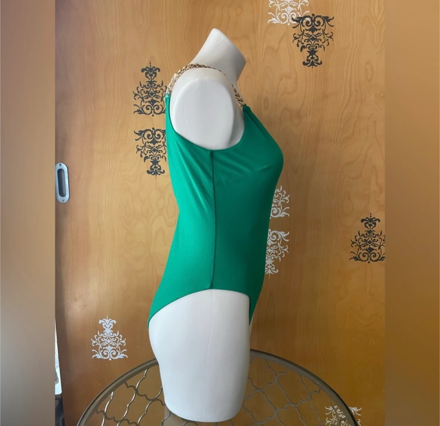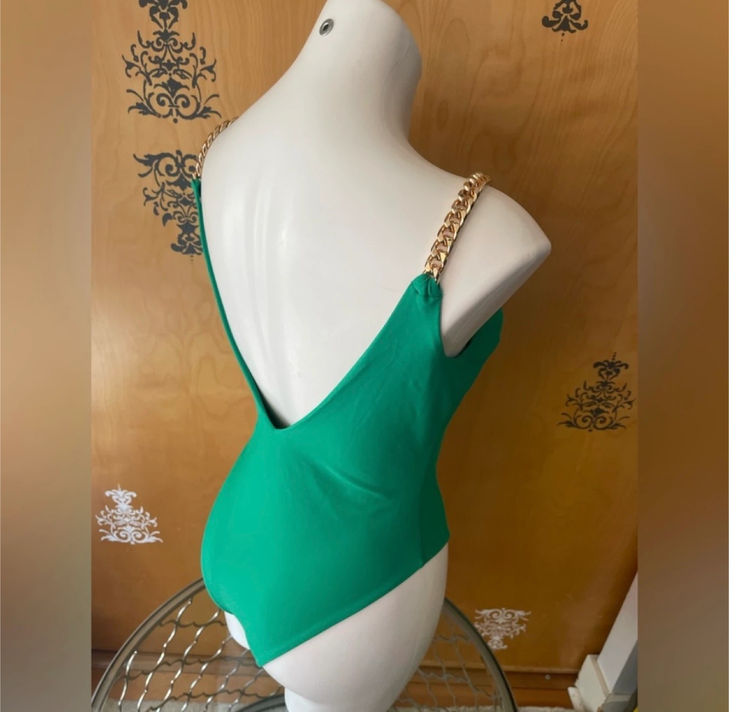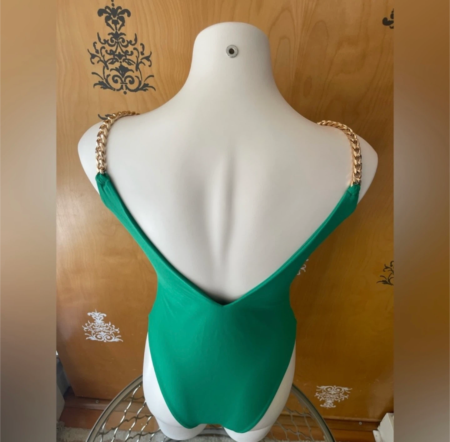 NWT Green V-Neck One Piece Dual Swimsuit & Bodysuit Gold Chain Straps High Cut S