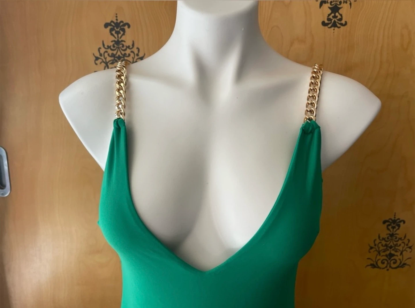The V-Neck One Piece With Gold Chains is all things luxurious. This stunning swimsuits V-neck design supports the bust while the high cut sides accentuate your curves, giving you an hourglass silhouette, exuding glamour. This vibrant shade green is both timeless and modern, offering a striking contrast to traditional swimwear colors like black or navy