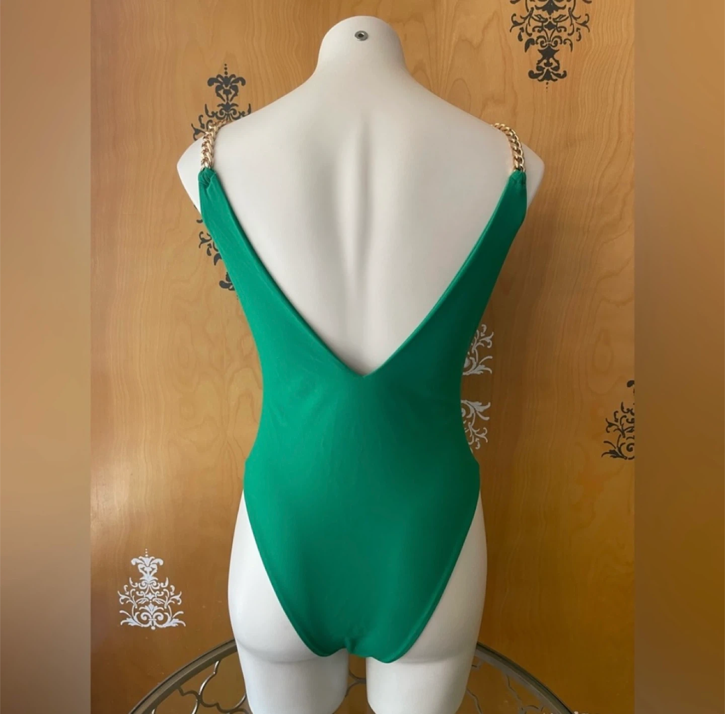 NWT Green V-Neck One Piece Dual Swimsuit & Bodysuit Gold Chain Straps High Cut S