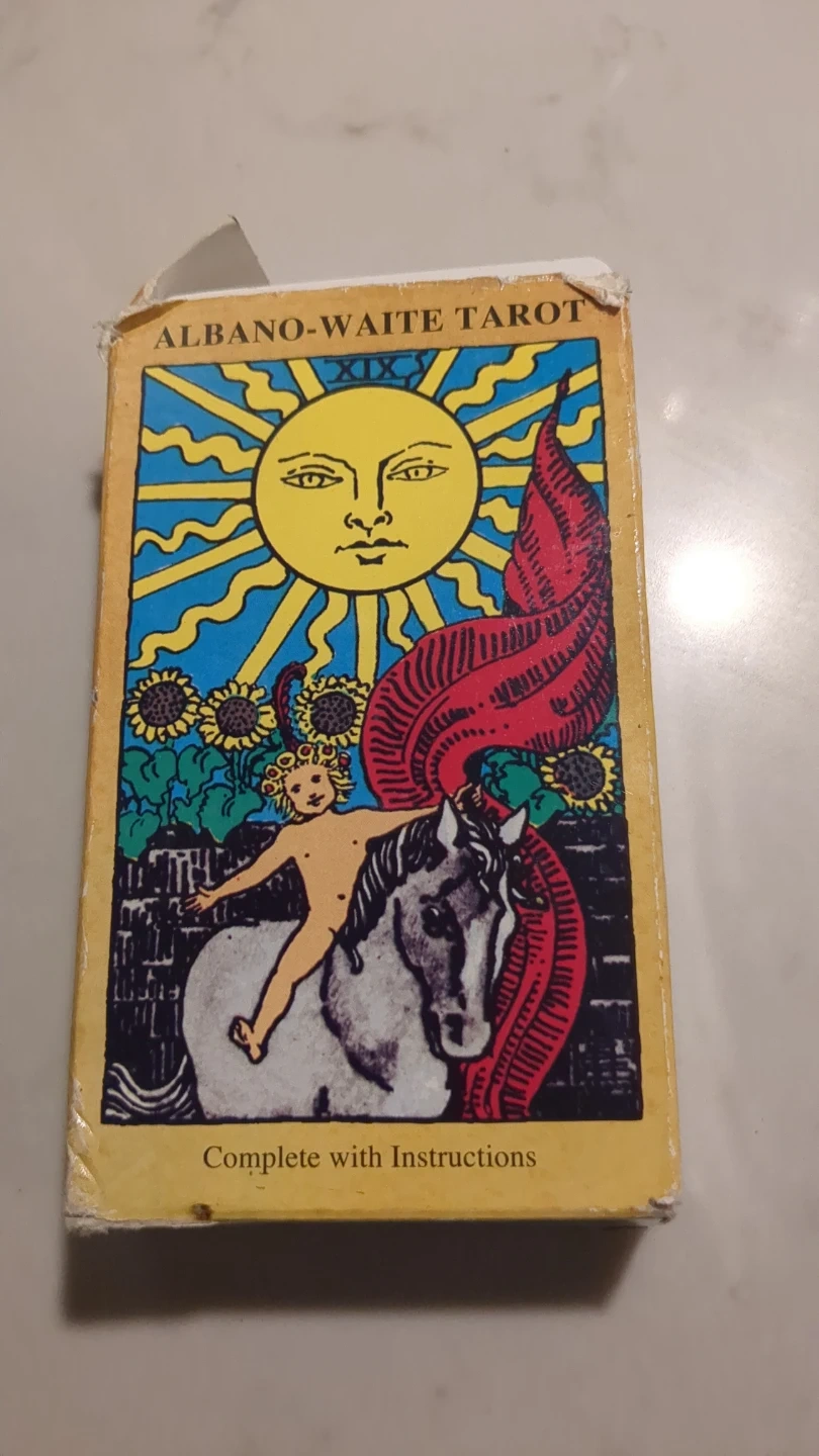 Selling an Albano-Waite Tarot deck! It comes complete with instructions and features 78 cards in vibrant full colour. Box is definitely damaged however all of the cards are in perfect shape!