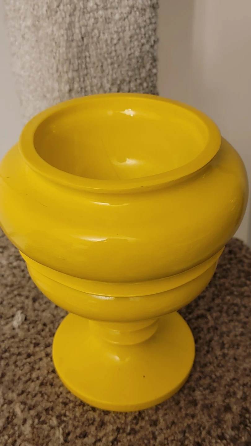 A vibrant yellow decorative vase with a pedestal base. Its cheerful colour makes it a lovely accent piece for any room. This vase has a smooth finish.