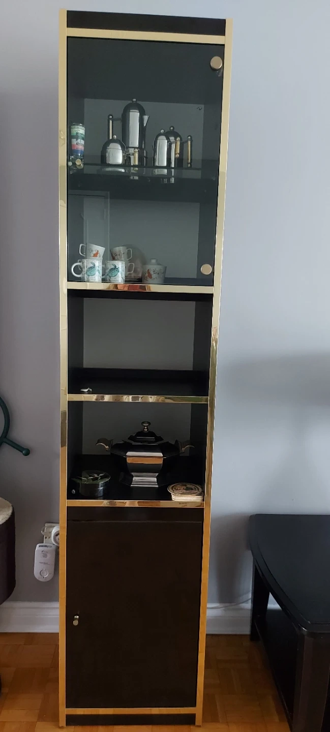 This tall gentky used display cabinet features glass doors on the upper section, perfect for showcasing items. It also includes closed storage at the bottom. The gold trim adds a touch of elegance.