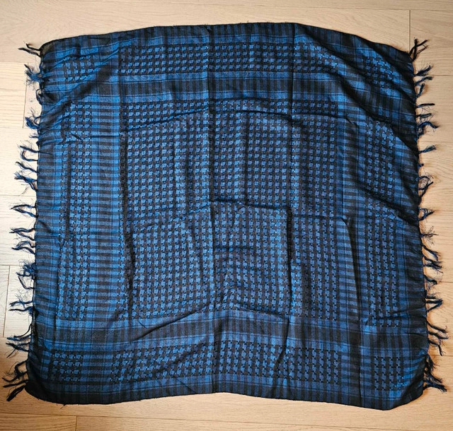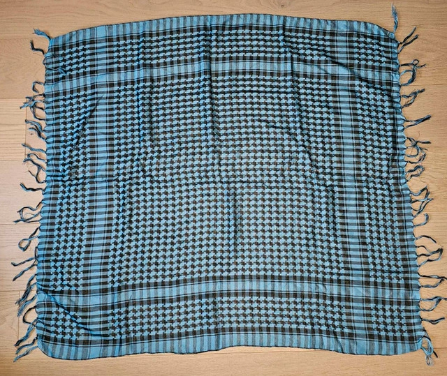 3 Middle Eastern Keffiyehs - Small 1 x Navy Blue 1 x Light Blue 1 x Deep Gold 60 CM x 60 CM Light Summer Nylon Weave $10 Each