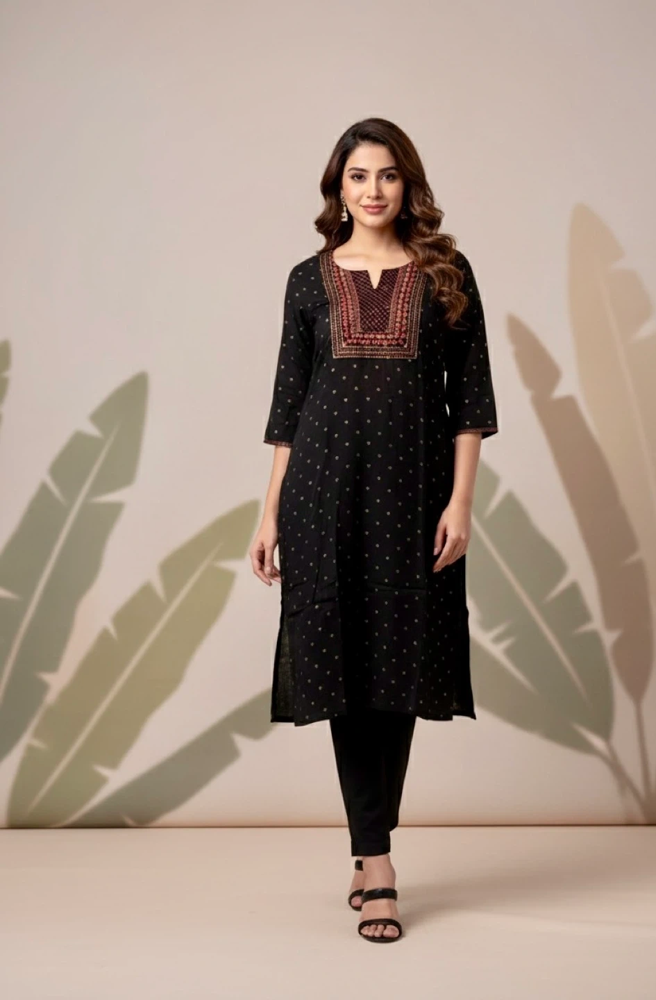 Black kurta featuring a V-neck with intricate embroidery and a subtle polka dot pattern. It has 3/4 sleeves and a straight hem with side slits. The fabric appears to be lightweight, suitable for everyday wear.