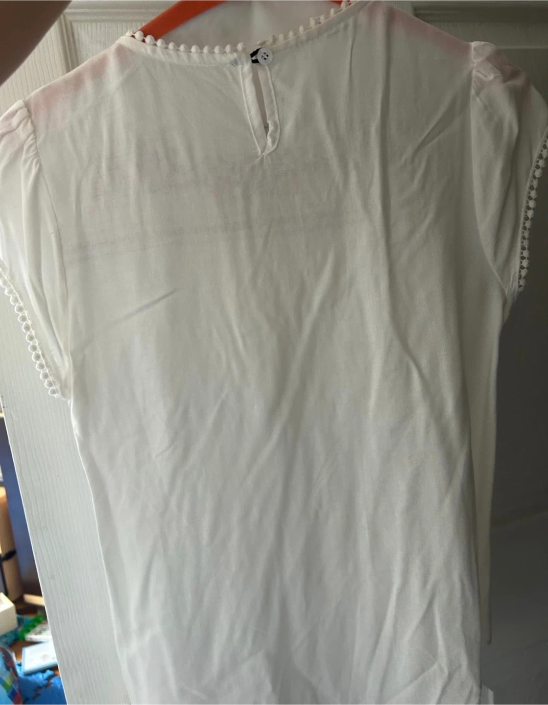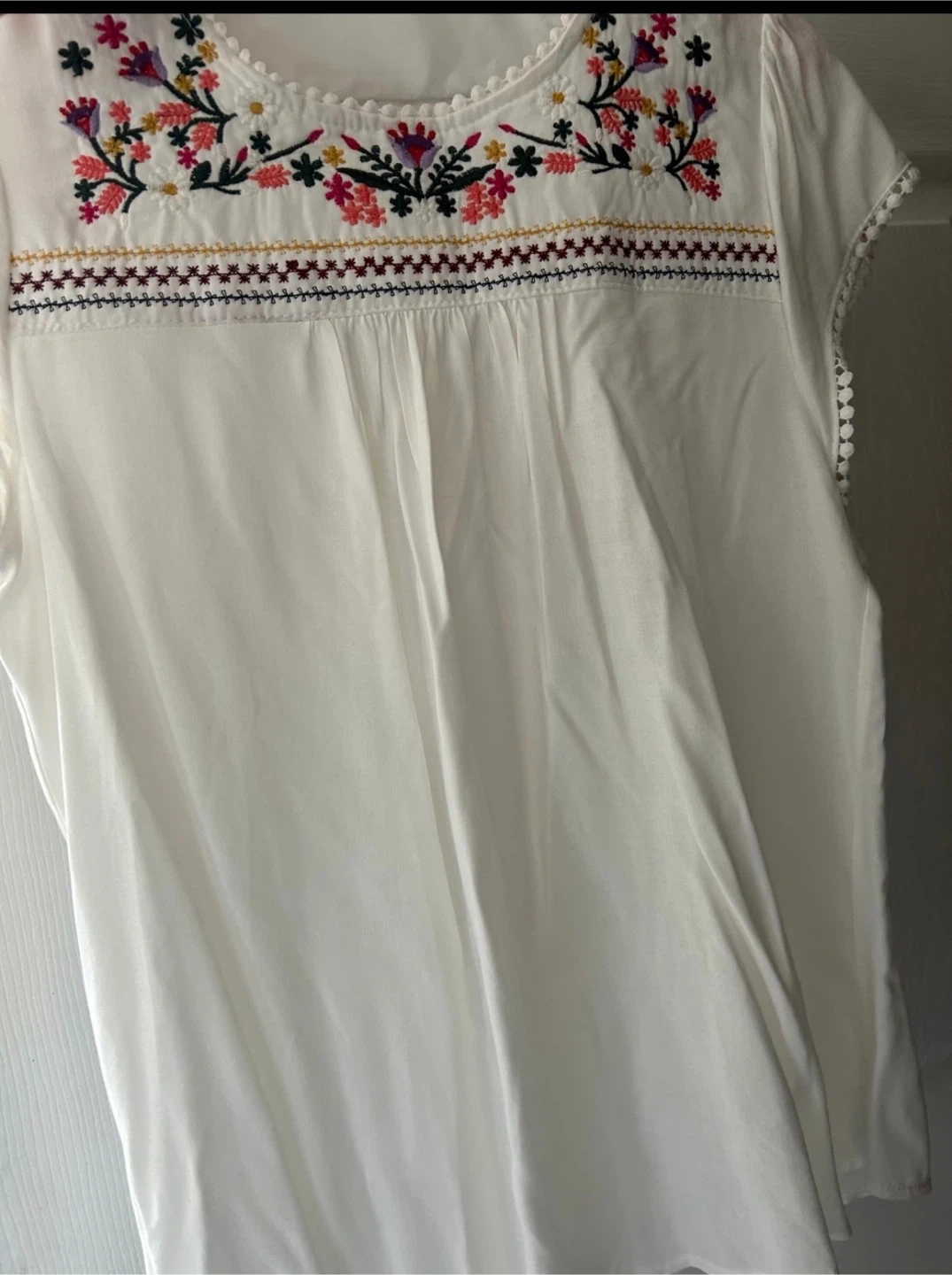 White short-sleeve top with colorful floral embroidery around the neckline and a decorative trim. It has a rounded neckline and playful pom-pom detailing on the sleeves and hem. Lightweight fabric for comfort.